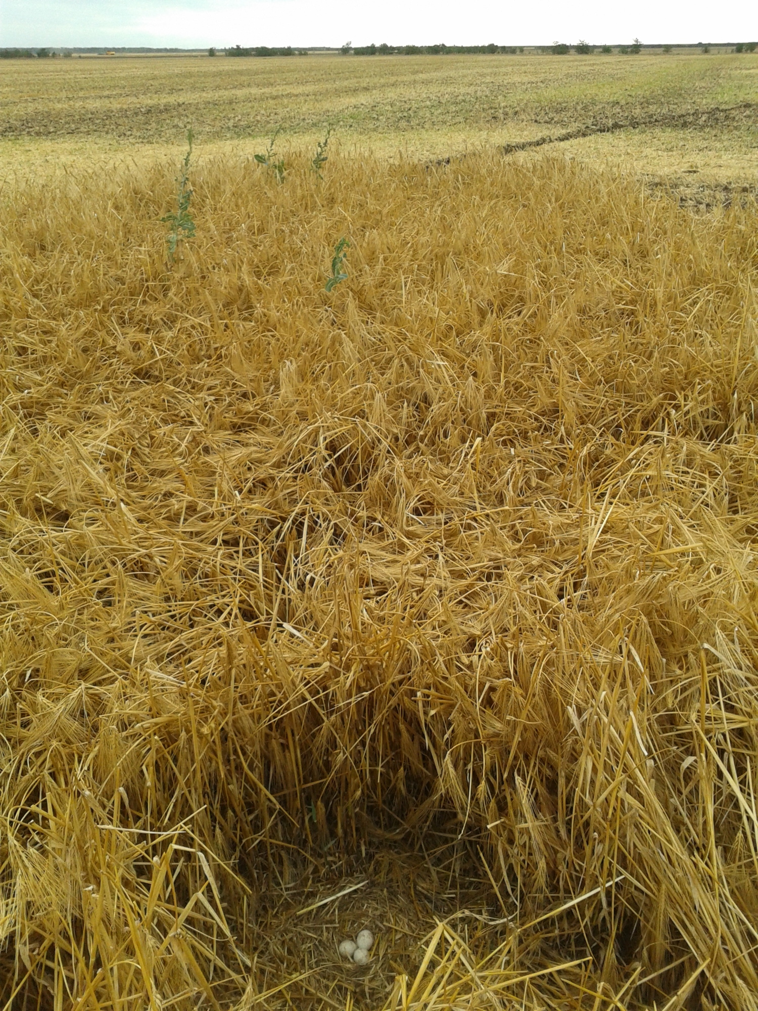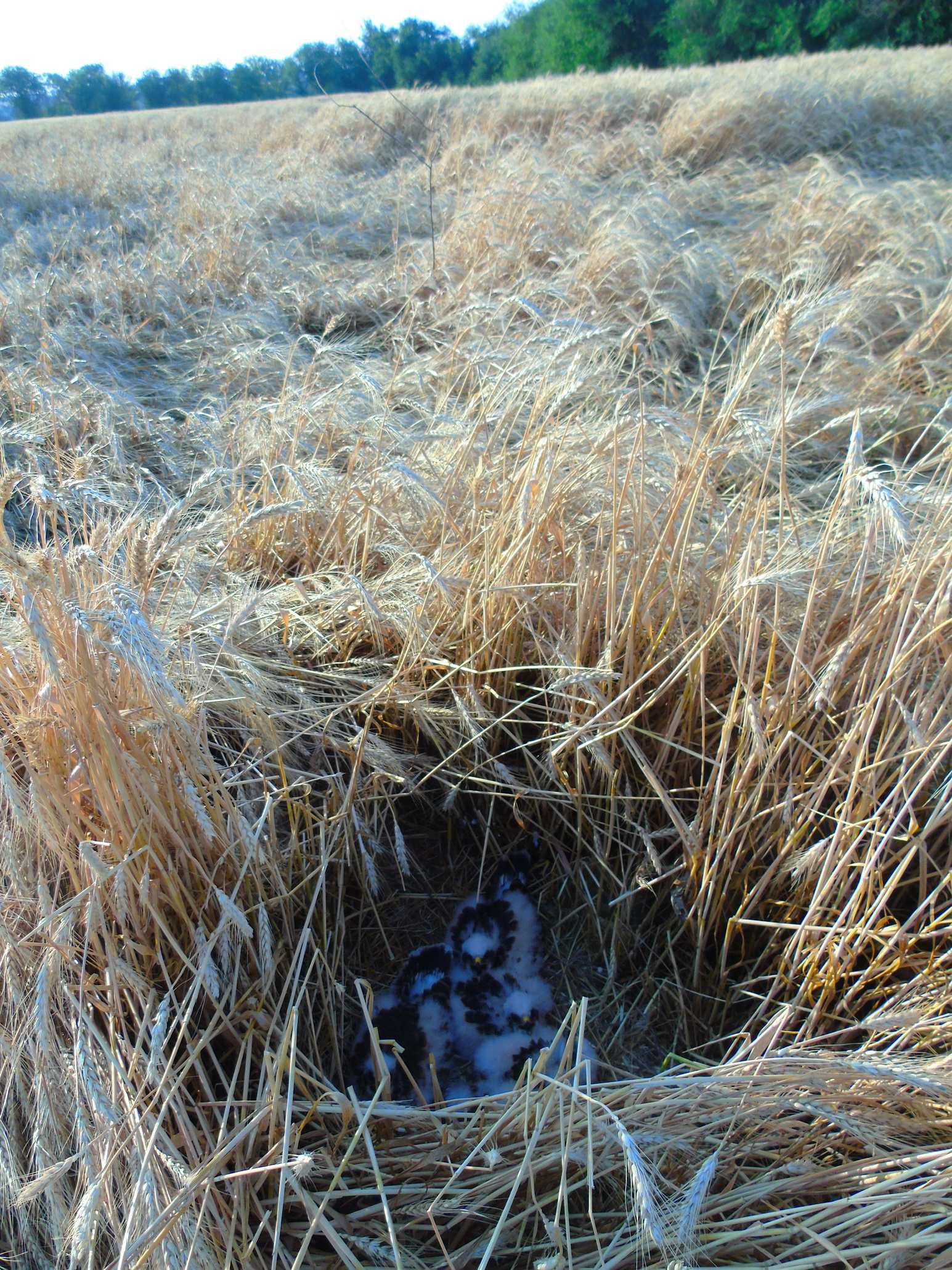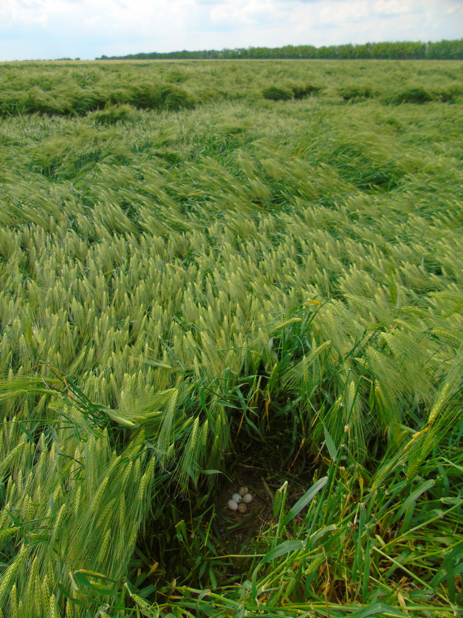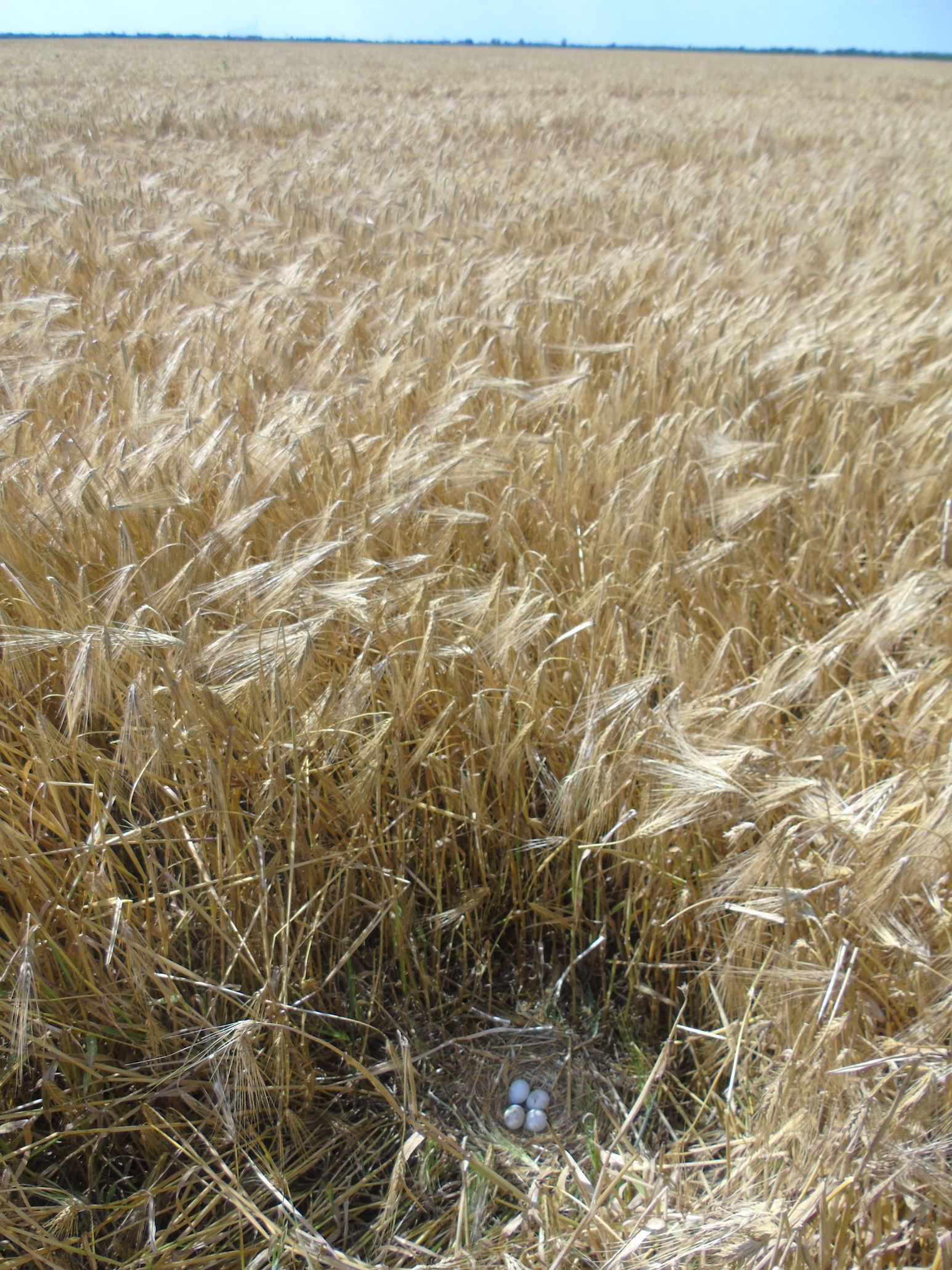 Вторая пара гнездилась примерно в 1 км от предыдущей, среди озимой пшеницы. В гнезде была очень поздняя кладка из 2-х яиц. Во время уборки урожая, 08.07.2020, вокруг гнезда также удалось оставить нескошенным участок пшеницы 10х15 м. В отличие от предыдущего поля здесь севооборот не предусматривал посадку сои и после уборки урожая поле осталось нетронутым. Но, к сожалению, это не способствовало сохранению гнезда, как и установленное нами заграждение из сетки, которое предусматривало защиту от непрошенных гостей и наземных хищников. Пара ещё довольно долго продолжала насиживание, но 25.07.2020, после сильного дождя и урагана, вся нескошенная пшеница у гнезда полностью полегла, что, вероятно, и стало причиной того, что птицы бросили кладку. Интересной особенностью гнездования данной пары было то, что незадолго до уборки урожая, 28.06.2020, примерно в 200 м от охраняемого гнезда, было найдено ещё одно – брошенное гнездо, в котором также было 2 яйца. Это косвенно подтверждает, что охраняемое гнездо было с повторной кладкой. Причина, по которой птицы бросили первое гнездо, так и осталась невыясненной.