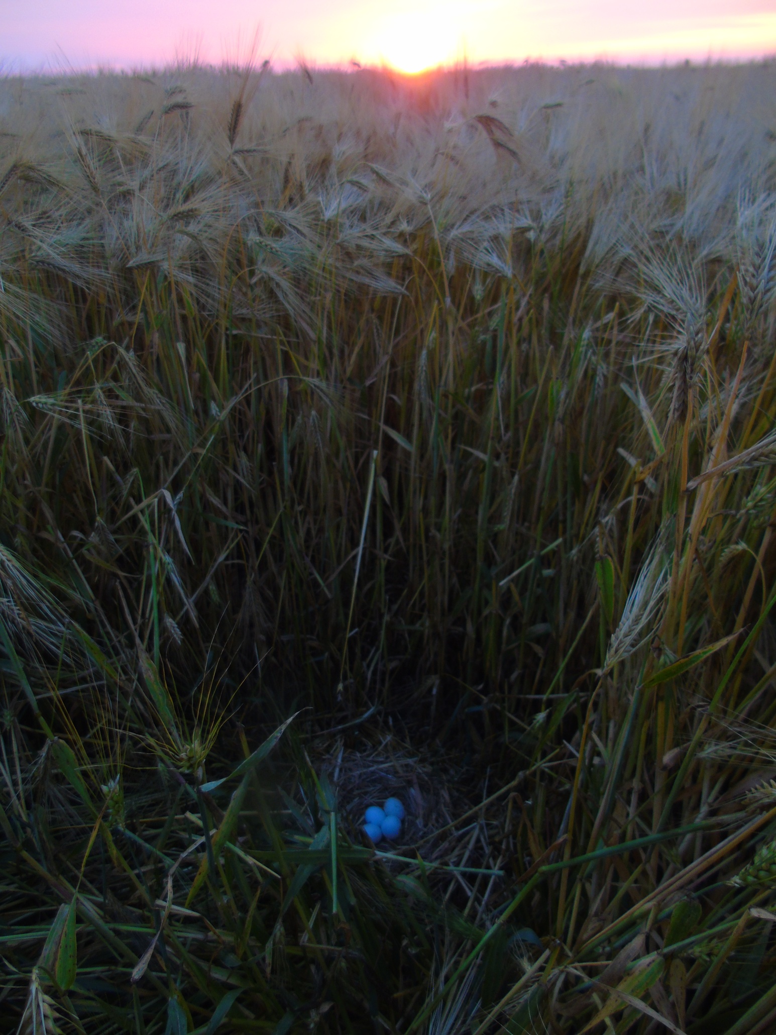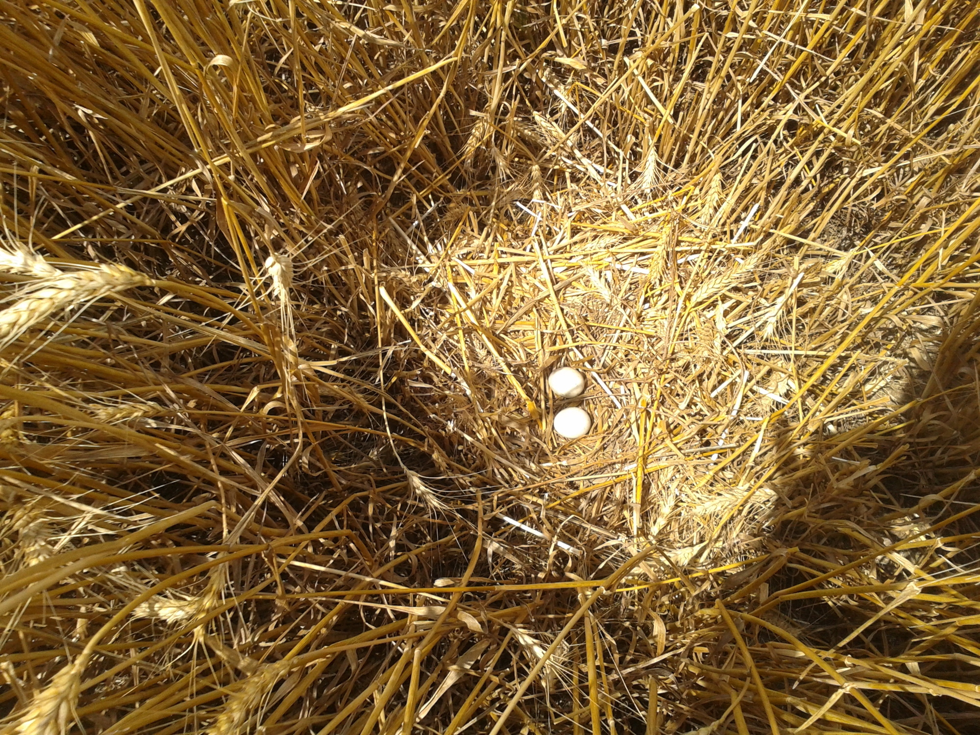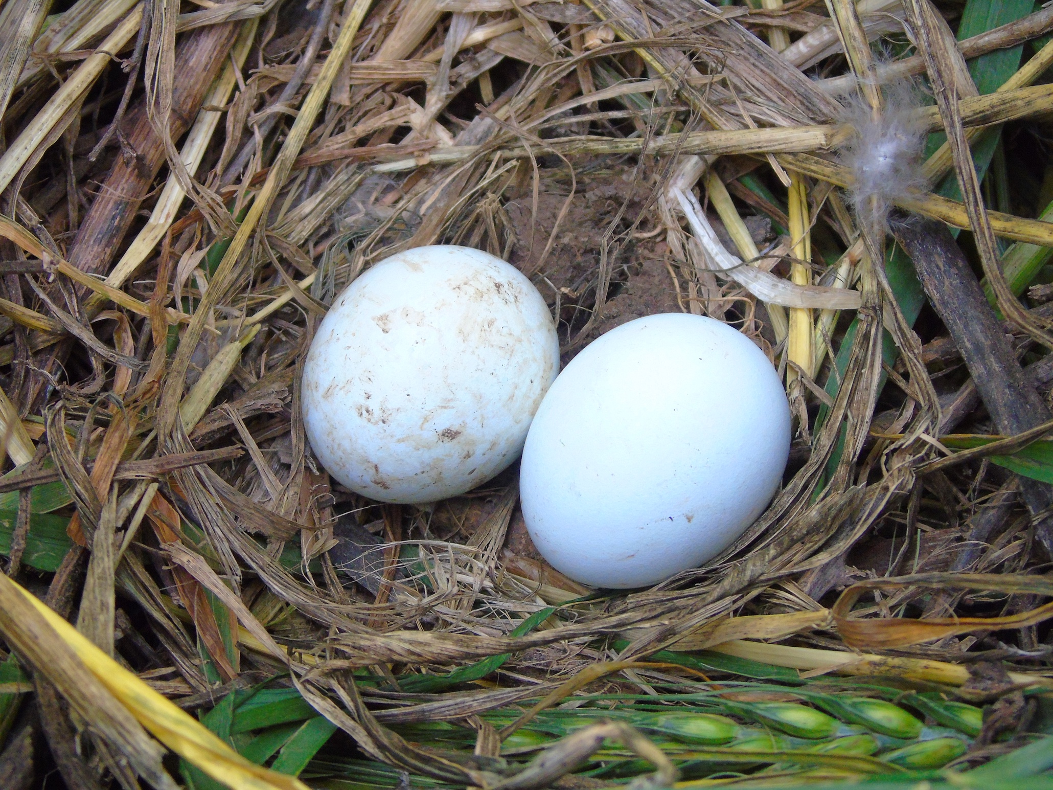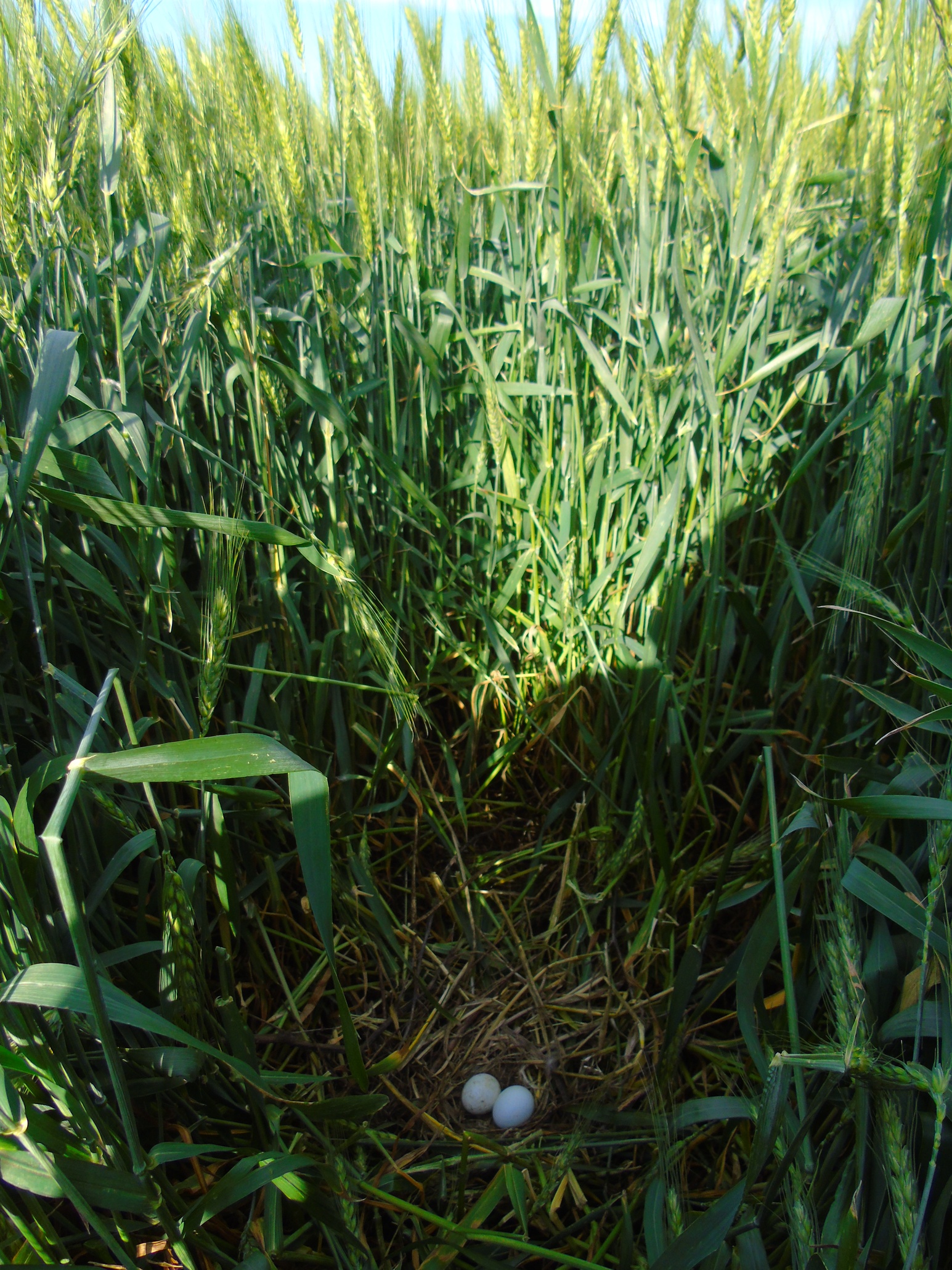 Вторая пара гнездилась примерно в 1 км от предыдущей, среди озимой пшеницы. В гнезде была очень поздняя кладка из 2-х яиц. Во время уборки урожая, 08.07.2020, вокруг гнезда также удалось оставить нескошенным участок пшеницы 10х15 м. В отличие от предыдущего поля здесь севооборот не предусматривал посадку сои и после уборки урожая поле осталось нетронутым. Но, к сожалению, это не способствовало сохранению гнезда, как и установленное нами заграждение из сетки, которое предусматривало защиту от непрошенных гостей и наземных хищников. Пара ещё довольно долго продолжала насиживание, но 25.07.2020, после сильного дождя и урагана, вся нескошенная пшеница у гнезда полностью полегла, что, вероятно, и стало причиной того, что птицы бросили кладку. Интересной особенностью гнездования данной пары было то, что незадолго до уборки урожая, 28.06.2020, примерно в 200 м от охраняемого гнезда, было найдено ещё одно – брошенное гнездо, в котором также было 2 яйца. Это косвенно подтверждает, что охраняемое гнездо было с повторной кладкой. Причина, по которой птицы бросили первое гнездо, так и осталась невыясненной.