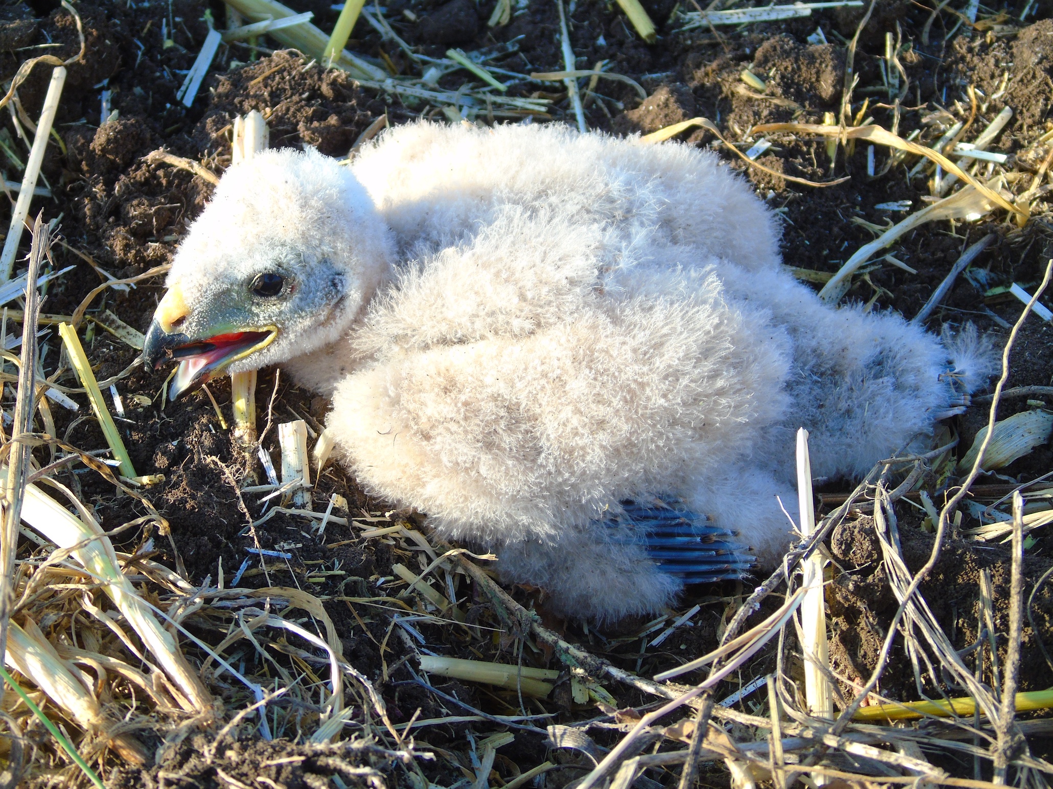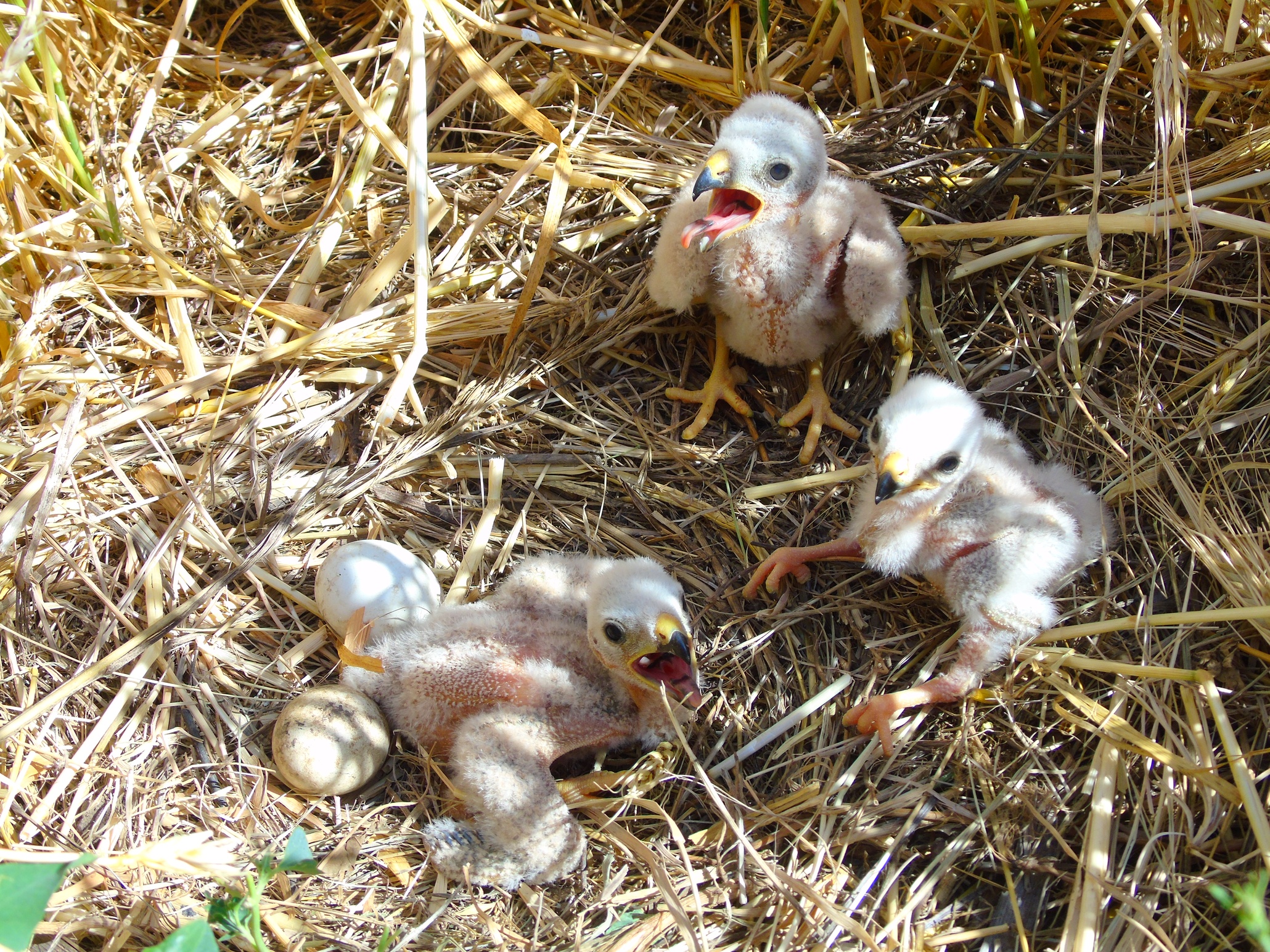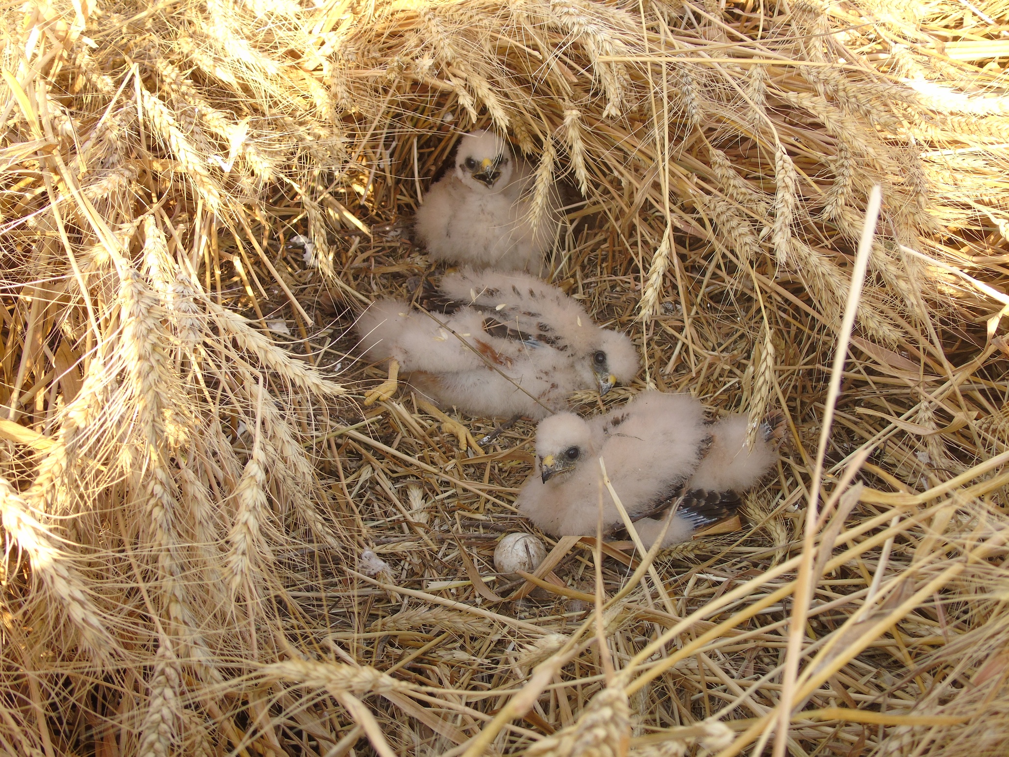 В 2019 г. удалось найти 3 гнезда луговых луней. Все они располагались в посевах озимой пшеницы и ячменя в окр. с. Волчанское и с. Юрьевка. Здесь 20.05 и 24.05. осмотрены две кладки по 5 яиц разной степени насиженности. Ещё одна поздняя, возможно, повторная кладка из 2-х свежих яиц найдена 28.05. Первые два гнезда мы проверили 15.06. и 16.06. В первом было 5 довольно крупных пуховиков. Во втором – три пуховика более младшего возраста и два яйца-«болтуна». Но при очередной проверке 19.06. оказалось, что на всех полях началась уборка урожая. Пятерых птенцов из первого гнезда удалось спасти только благодаря поломке комбайна поблизости от гнезда. На двух других полях кладка и выводок погибли. Каким-то образом после уборки и культивации ячменя уцелел лишь один птенец из второго гнезда и его также удалось спасти. Всех птенцов мы передали в Киевский зоопарк.