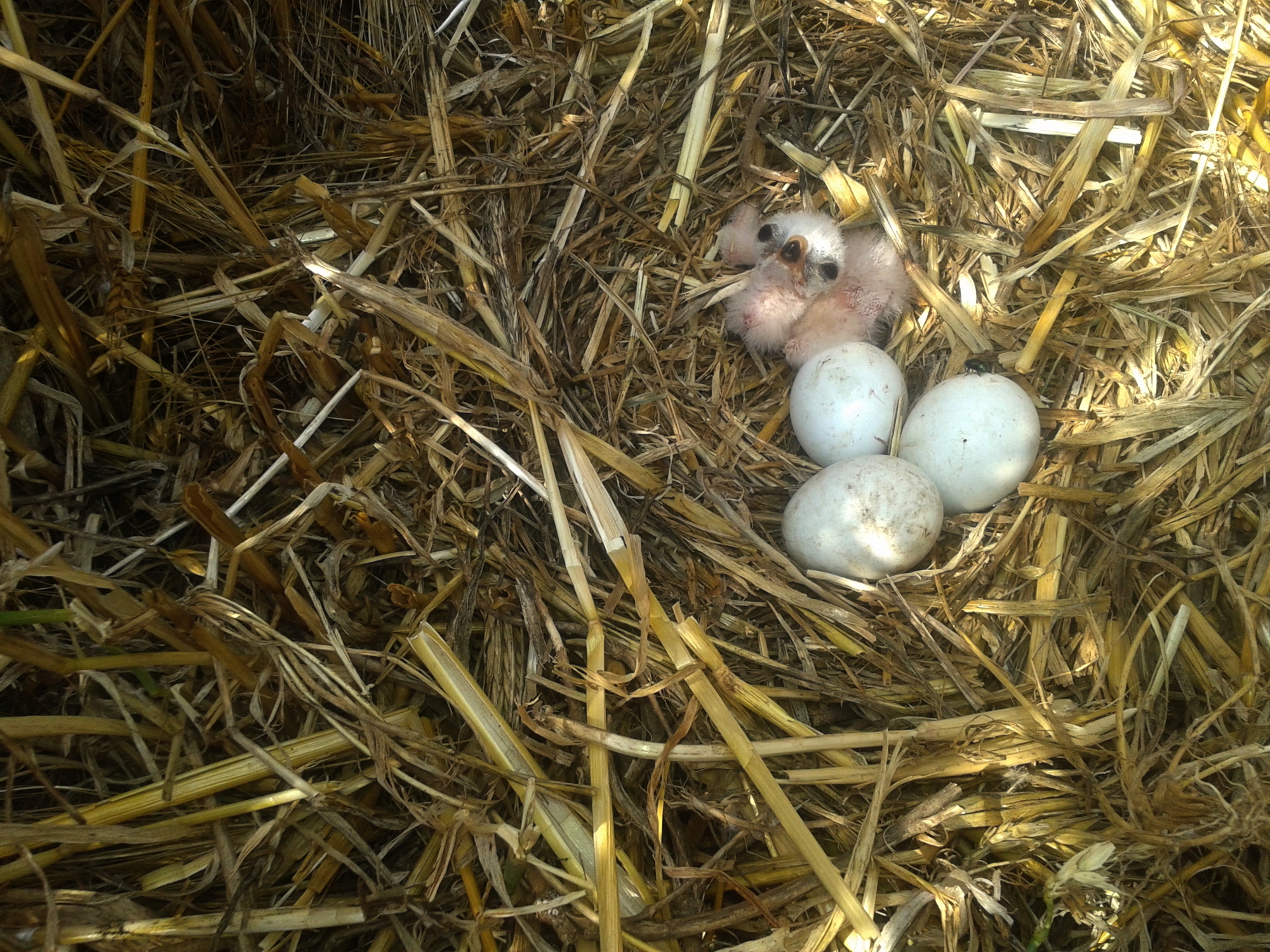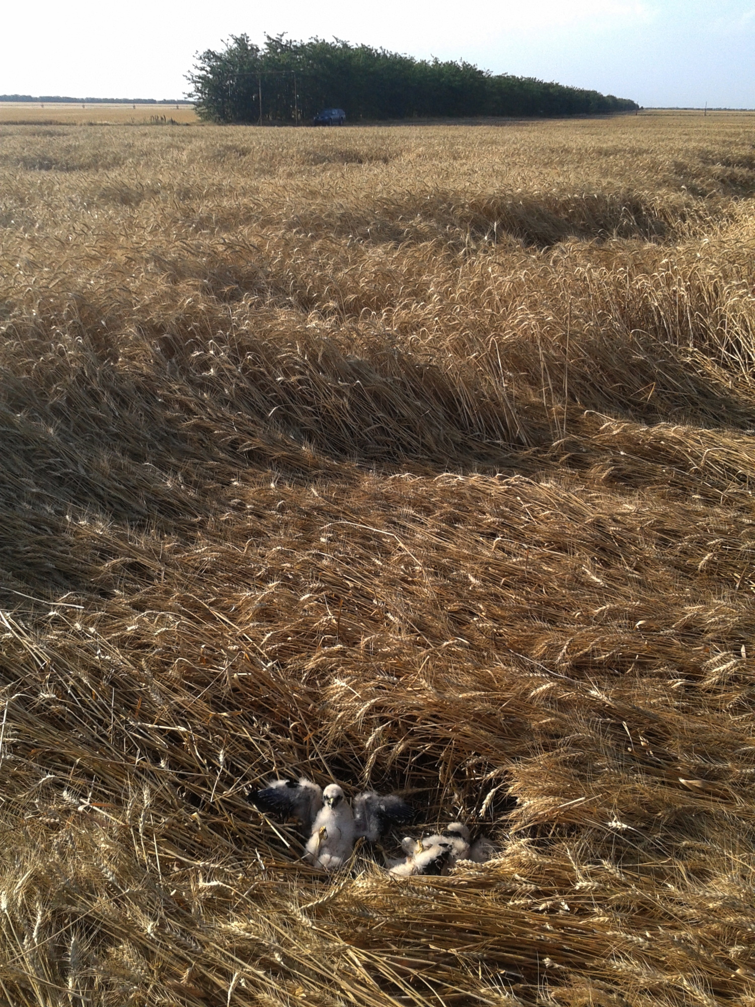 Остальные подконтрольные гнёзда луговых луней в этом году располагались на двух соседних полях севернее с. Волчанское. Здесь мы также предприняли меры по их спасению. Но этот опыт был не совсем удачным. Так, на одном из полей этого хозяйства пара луней поселилась среди озимого ячменя. В гнезде перед уборкой урожая, 28.06., ещё была кладка из 4-х яиц. Главный агроном агрофирмы Шулимов Василий Иванович также помог нам сохранить нетронутым участок поля вокруг гнезда, примерно 10х10 м. Но особенность севооборота на этом поле заключалась в том, что его сразу после уборки ячменя вспахали и засеяли соей, причём сразу же была включена поливная установка кругового действия «Фрегат», которая не менее одного раза в сутки очень медленно проходила над гнездом. Печально, что прохождение поливной установки совпало с началом вылупления птенцов (02.07.). После прохождения первого круга самка еще пыталась насиживать, но после второго круга пара бросила гнездо, причём, остальные птенцы так и не вылупились (05.07.). Негативную роль в этом случае сыграл также фактор беспокойства со стороны человека, так как, неожиданный ажиотаж у местных работников хозяйства, приводил к частому вспугиванию самки с гнезда.