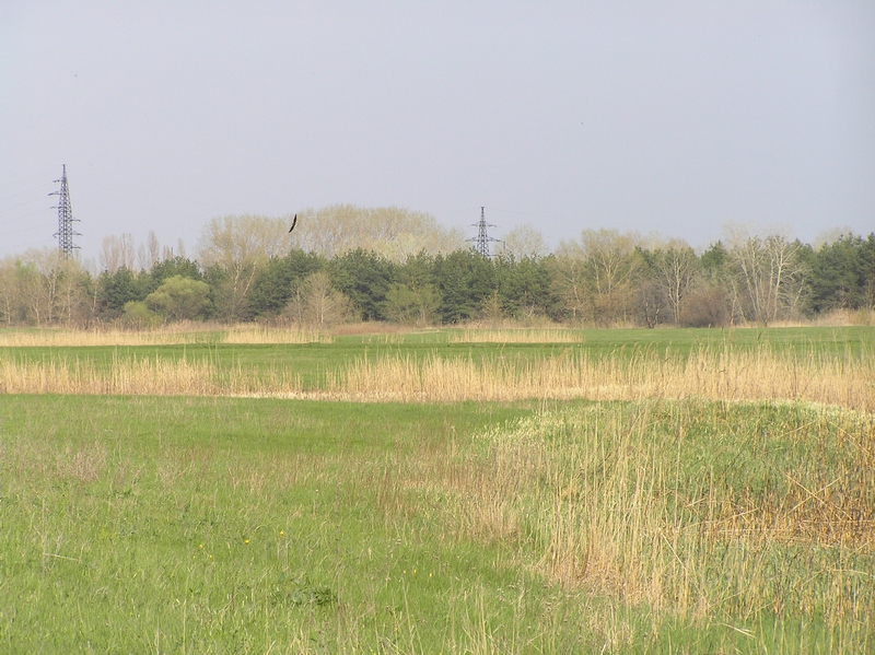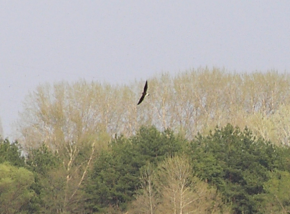 Новый залет был отмечен нами 27.04.2011 р. во время экспедиции в пойме р. Орель на границе Днепропетровской (окр. с. Гупаловка, Магдалиновский р-н) и Полтавской (окр. с. Нехвороща, Новосанжарский р-н) областей. Здесь проходит канал Днепр-Донбасс. Мы ехали на автомобиле вдоль русла реки, я заметила вдали крупного хищника, сидящего на дереве. Сначала я пыталась рассмотреть птицу в бинокль, сразу обратила внимание на коричнево-рыжеватую окраску оперения. К большому сожалению, сфотографировать сидящую птицу не удалось. Фотоаппарат был в рюкзаке, пока я его вытащила, остановили машину, птица слетела с дерева, удалось сделать только этот снимок птицы в полете.