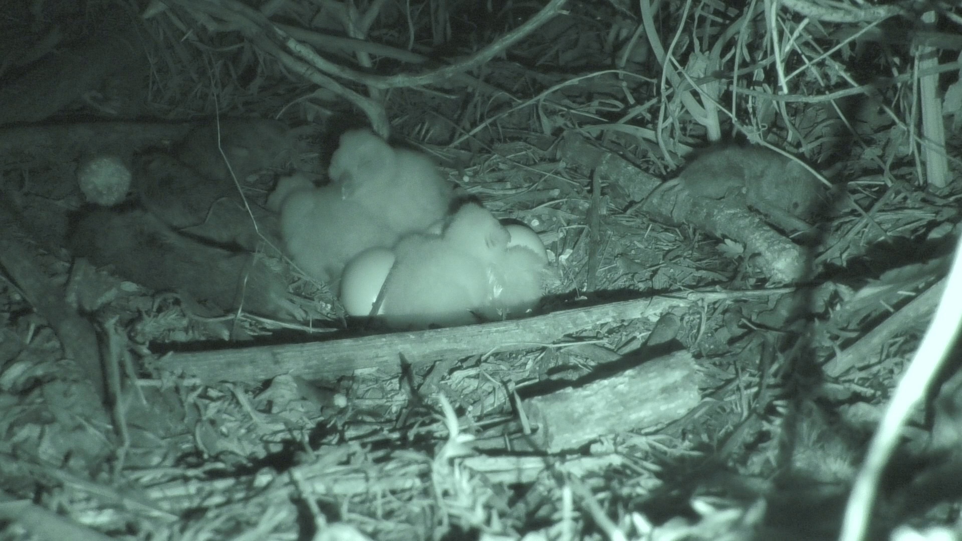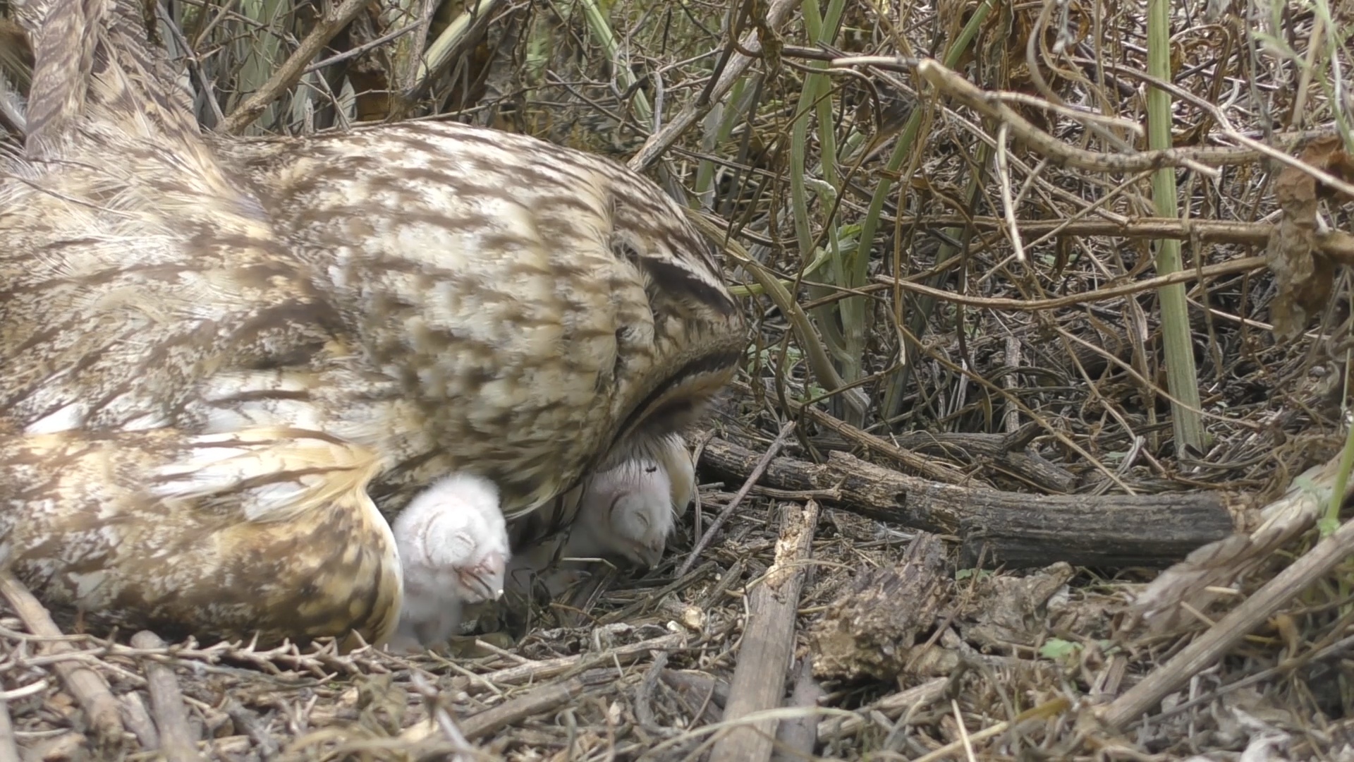Вилуплення першого пташеняти почалось у вечірній час 14.06.2020 р. – коли самка піднімалась, було помітно проклюнете яйце та чутно писк пташеняти. Попри це, самка продовжувала ненадовго залишати гніздо у цей період. У ніч на 15 червня відбулося вилуплення пташеня, після чого шкаралупа була з’їдена самкою. Друге пташеня вилупилось через добу, в ніч на 16 червня. Характерно, що до гнізда часто навідувались мишоподібні гризуни, проте самка на них практично не реагувала, лише інколи намагалась атакувати дзьобом. Встановлення нами камери біля гнізда тривало до ночі на 19 червня, коли вже вилупилось 4 пташенят. Після цього ми вимушені були перервати спостереження через необхідність від’їзду.