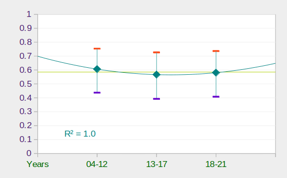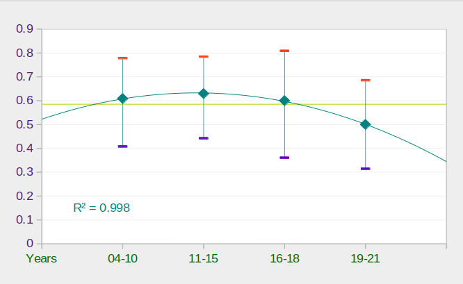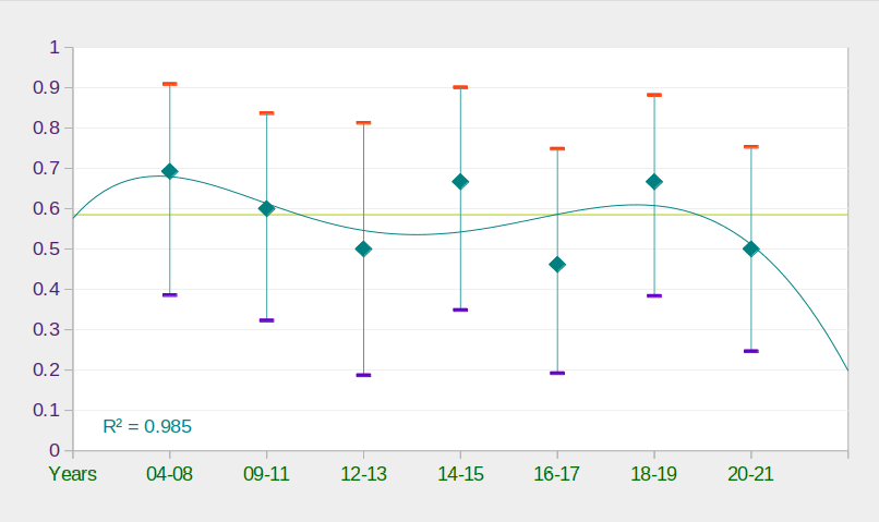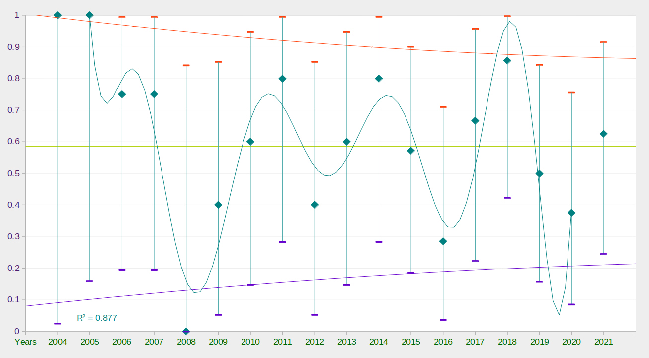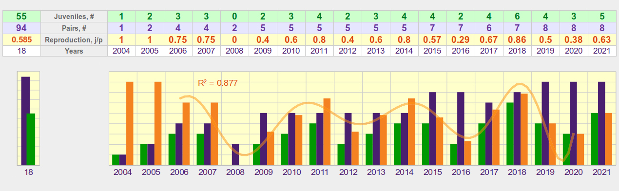У середньому можна вважати, що для стабільної популяції у 7 територіальних пар змієїдів успішно лишають гніздо 4 пташенят. За даними французьких дослідників успіх розмноження коливається від пари до пари, від року до року, при цьому, найпотужнішим фактором, що впливає на кінцевий результат розмноження, є погодні умови у найбільш чутливі періоди репродуктивного циклу. Ми не маємо достатньої кількості спостережень за один рік, щоб підтвердити річні коливання, але індивідуальна різниця статистично виражена і серед наших підконтрольних пар. Структура отриманих даних наведена на діаграмі 1. Найбільша кількість пар, за якими тривали спостереження протягом одного року – 8, тобто менше 10% від загальної чисельності змієїда в трьох областях. Продуктивність має помітну статистичну різницю лише для 2016 і 2018 років (2/7 проти 6/7). Тому для детальнішого вивчення річних коливань успіху розмноження необхідно залучити більше спостерігачів і включити до програми моніторингу більшу кількість гніздових пар змієїдів. Однак, загальний масив зібраних даних дозволяє проаналізувати, чи наявні будь-які тенденції, виражені в часі. З цією метою ми об’єднали дані за декілька років у послідовні періоди за розміром вибірки: не менше 10, не менше 20 та не менше 30 пар на сезон розмноження. Результати порівняння показника продуктивності за ці періоди наведені на діаграмах 3, 4, 5. Аналізуючи отримані результати, можна дійти висновку, що різниця, а відповідно, і можливі тенденції зміни продуктивності за весь період спостережень з 2004 по 2021 рр. не знаходять статистичного підтвердження, тобто продуктивність розмноження змієїда на півночі України виглядає сталою і в середньому відповідає значенню, що характеризує стабільну популяцію.