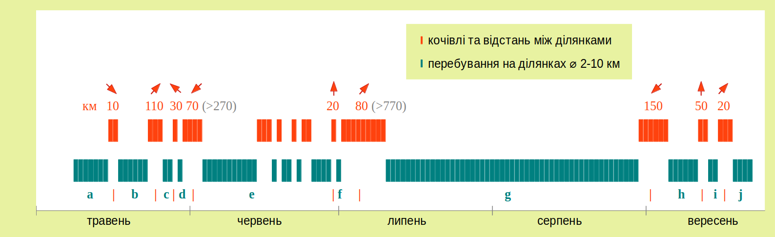 На діаграмі наведений розподіл часу в днях: синьо-зеленим – коли змієїд не полишав меж певних обраних ділянок, помаранчевим – коли вилітав у різних напрямках, але повертався назад, або пересувався від попередньої ділянки до наступної (з першої a до останньої j):