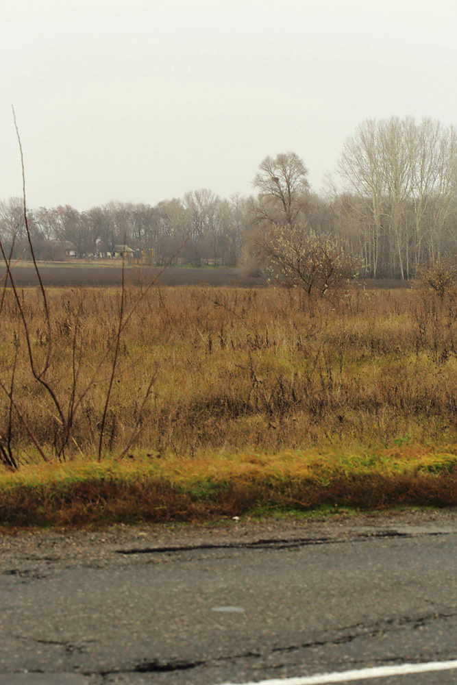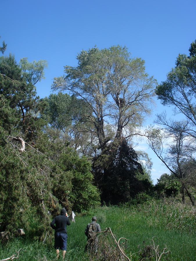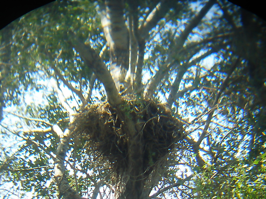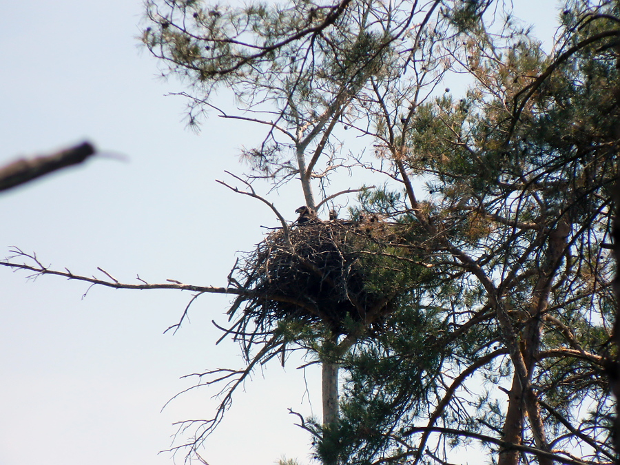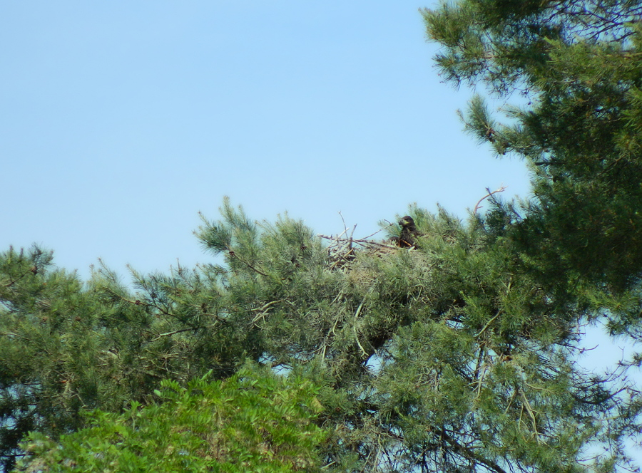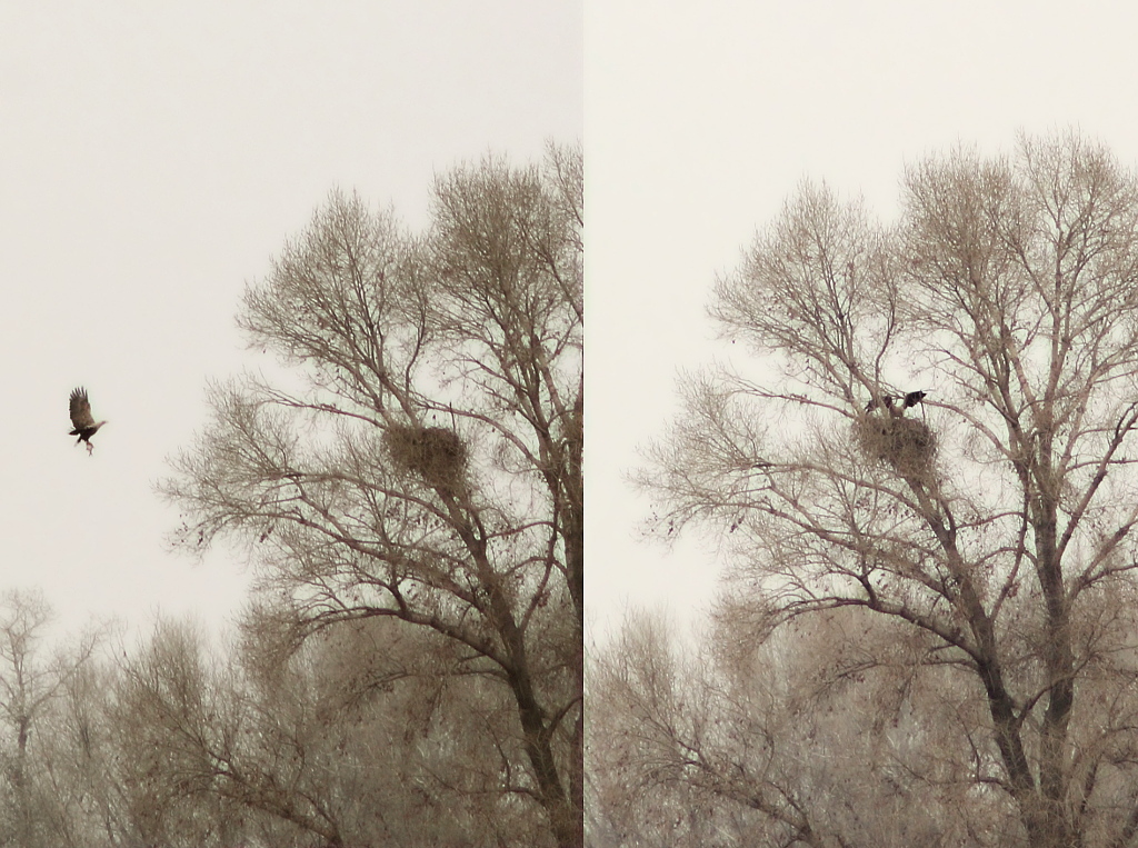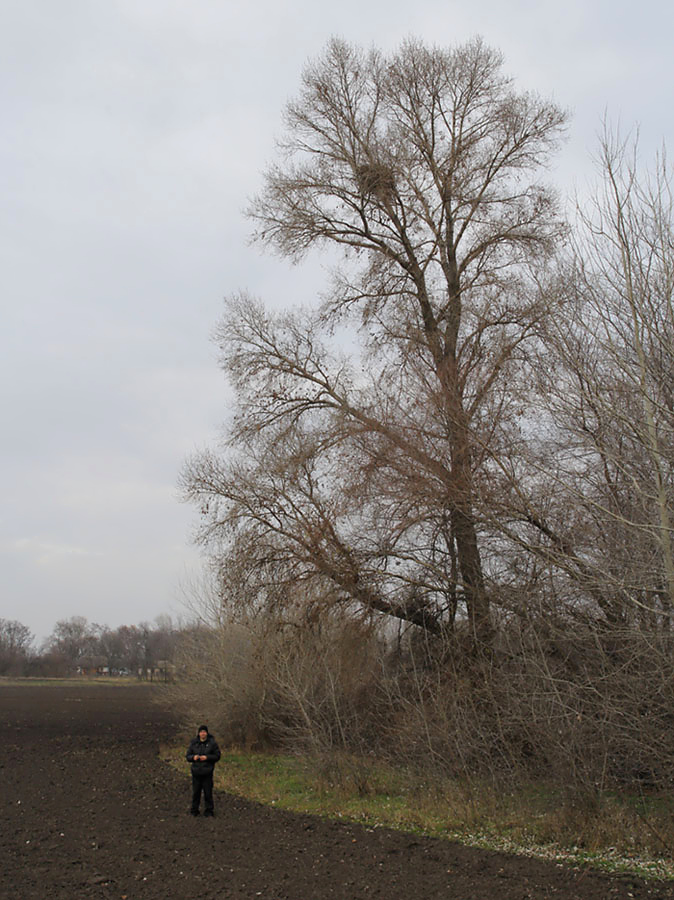 На протяжении двух сезонов нами получены данные о 22 парах орланов. Из них 7 – в Киевской области, 10 – в Черкасской, 3 – в Полтавской и 2 – в Кировоградской. Ни одна из известных нам ранее пар не прекратила свое существование, появились четыре новые. Причем гнездование одной из новых пар вызывает особый интерес, поскольку орланы демонстрируют новые адаптации по отношению к антропогенному фактору. Впервые о необычной паре орланов в районе Сульского залива Кременчугского водохранилища нам сообщил Н.Л. Клестов летом 2013 года. По его словам, орланы загнездились прямо на краю села и егерь, сообщивший об этом факте, мог наблюдать за птицами, что называется, из двора собственного дома. Осмотреть данное место нам представилась возможность в ноябре 2013 г. Орланы устроили гнездо в небольшой группе деревьев среди сельхозугодий всего в 300 м от ближайших сельских усадеб и в 500 м от асфальтированной дороги, которая регулярно используется (см. фото). Само гнездо устроено в развилке раскидистого черного тополя диаметром 1 м, на высоте около 20 м. Конечно, такими случаями гнездования в Западной Европе уже никого не удивишь, но для нас такие гнезда пока в диковинку. Нам повезло – при обнаружении гнезда 23 ноября, пока мы его рассматривали издалека с дороги, появилась взрослая птица с рыбой в лапах, прилетела в гнездо и начала поедать добычу (см. фото). Факт также интересный, поскольку в негнездовое время орланы редко прилетают поедать добычу в гнездо.