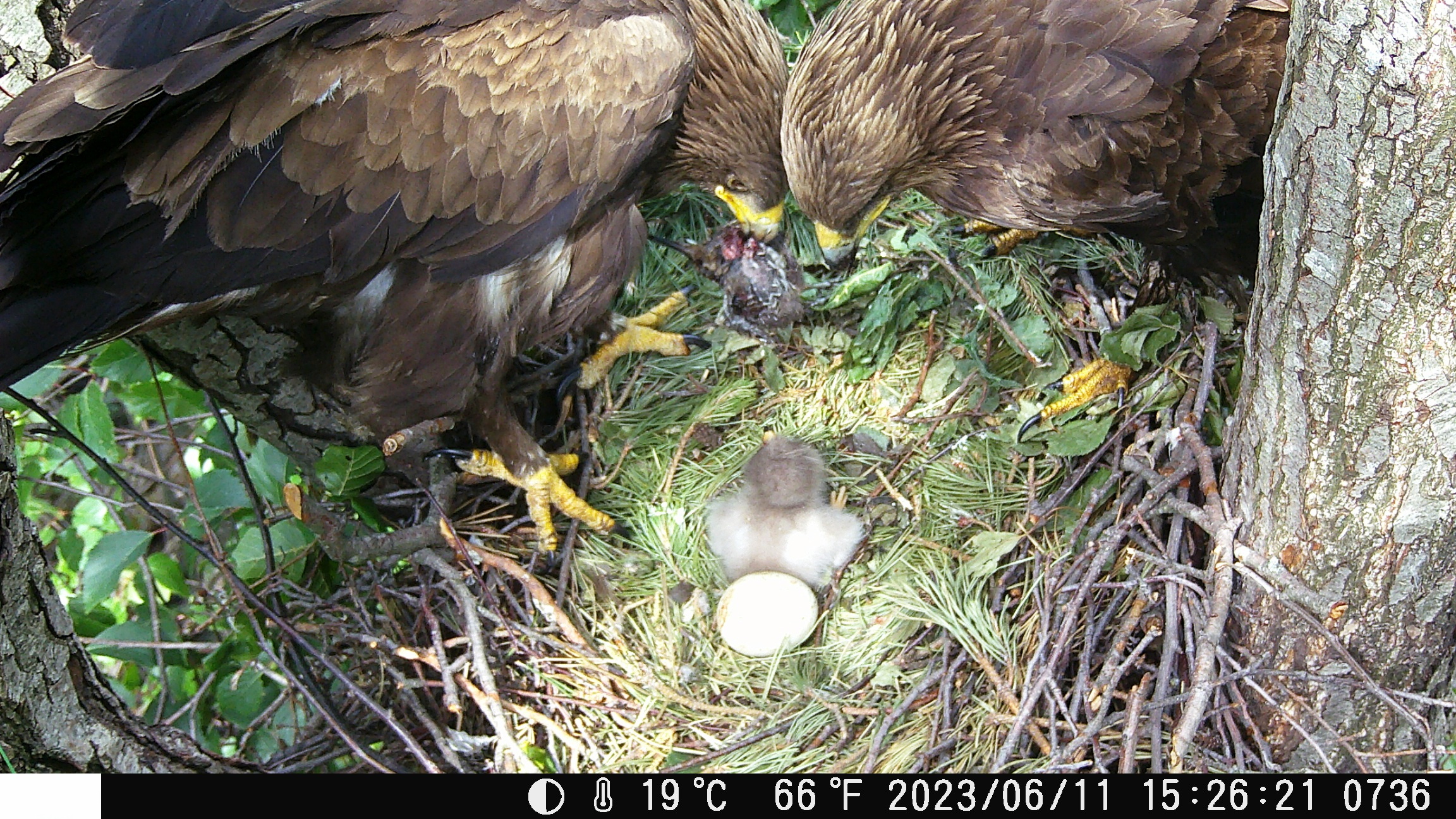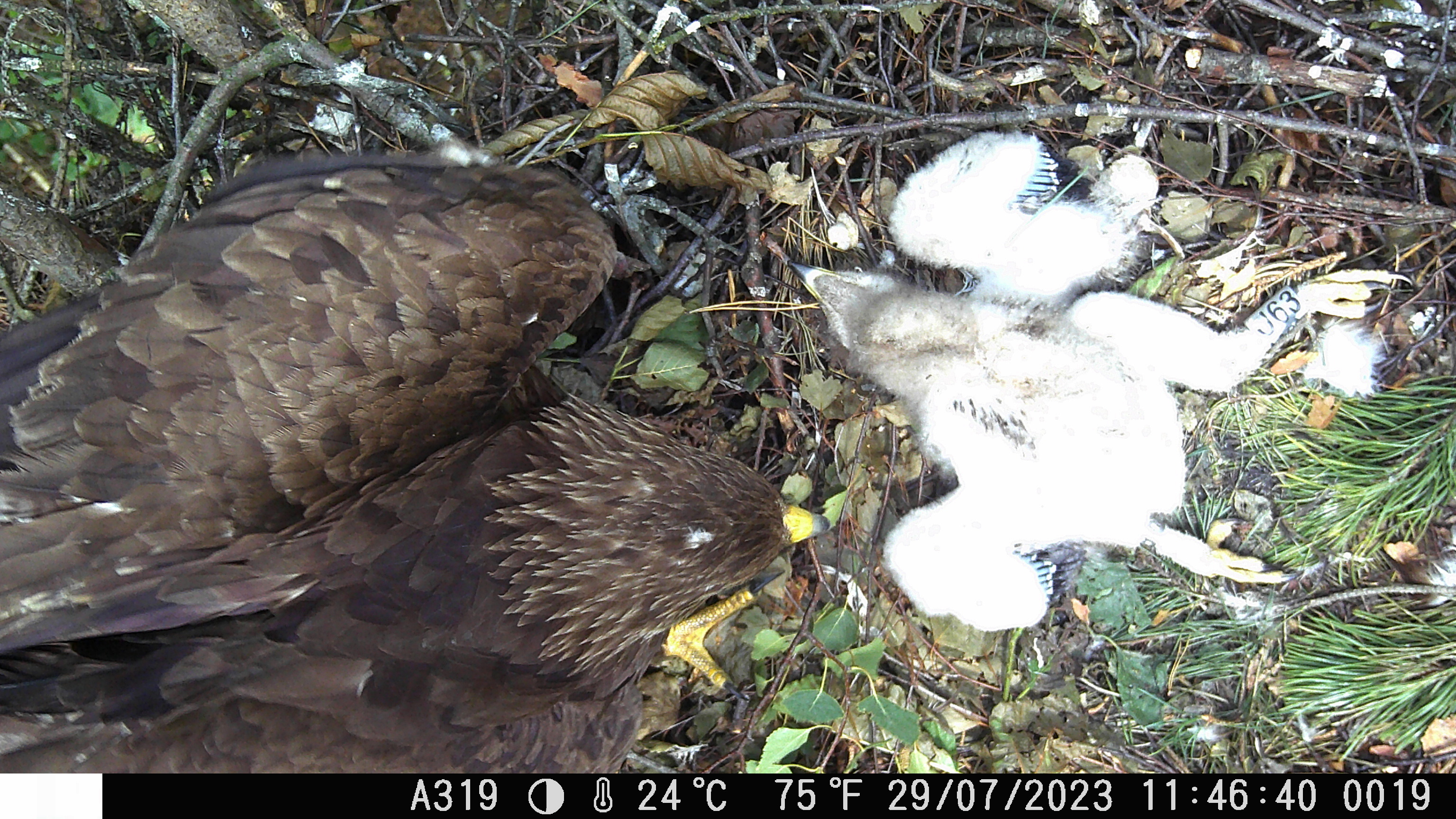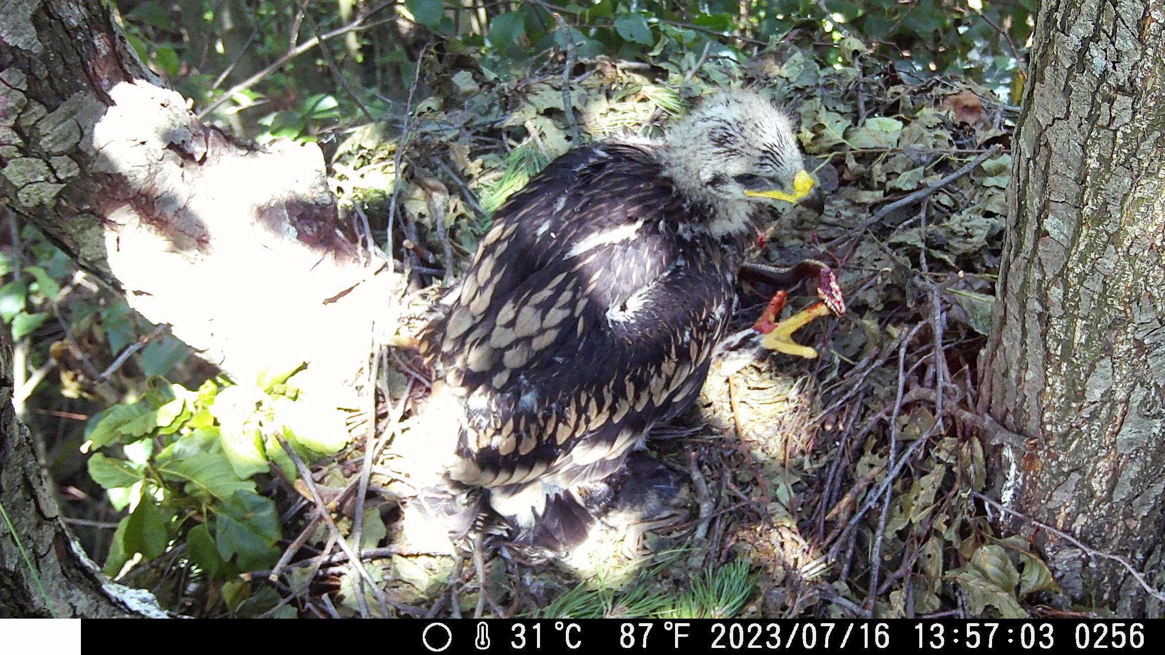 У підсумку з 7 пар великих підорликів, які зайняли свої гнізда навесні, 5 пар (71,4%) приймали участь у розмноженні. Середня успішність гніздування склала 50%, продуктивність 1,0 пташенят на пару, що приймала участь у розмножені, та 0,7 пташеня на всі пари. Такі показники є досить високими для даного виду, так як нормальним для підтримки популяції вважається показник у 30-50%. Відомо, що у підорликів великих практично завжди виживає одне пташеня. Існує безліч причин загибелі другого пташеняти – це каїнізм з боку іншого пташеняти, дефіцит корму, хижацтво, хвороби тощо. Завдяки фотопасткам нам вдалось з’ясувати причини загибелі пташенят, встановити успішність та продуктивність гніздування, отримати багато іншої інформації про гніздову екологію, результати яких ми представимо у наступних дописах.