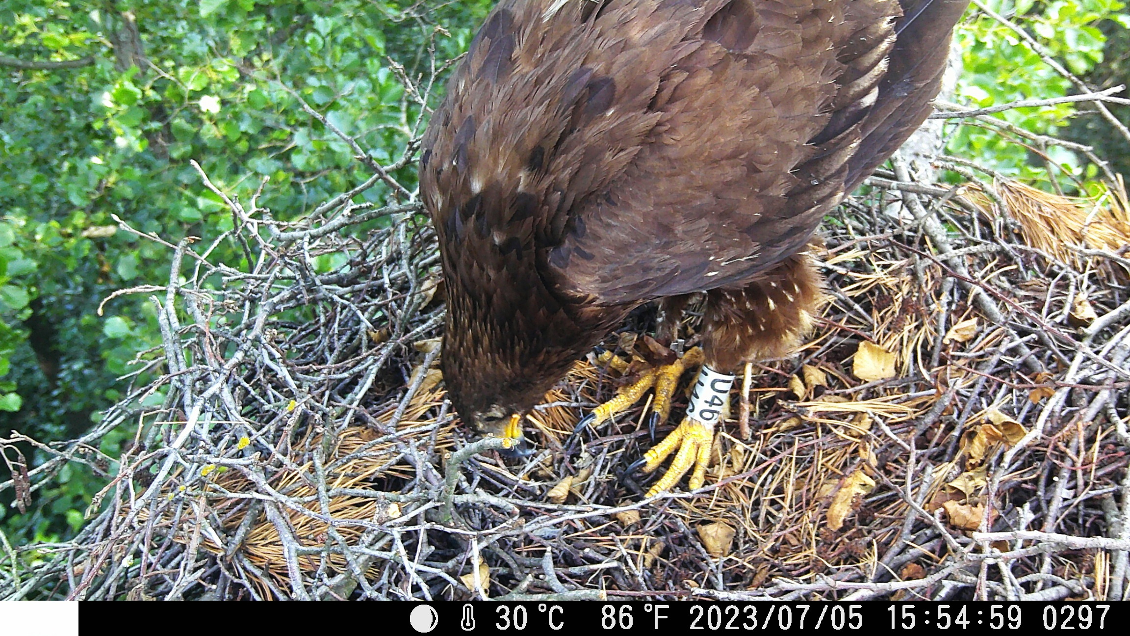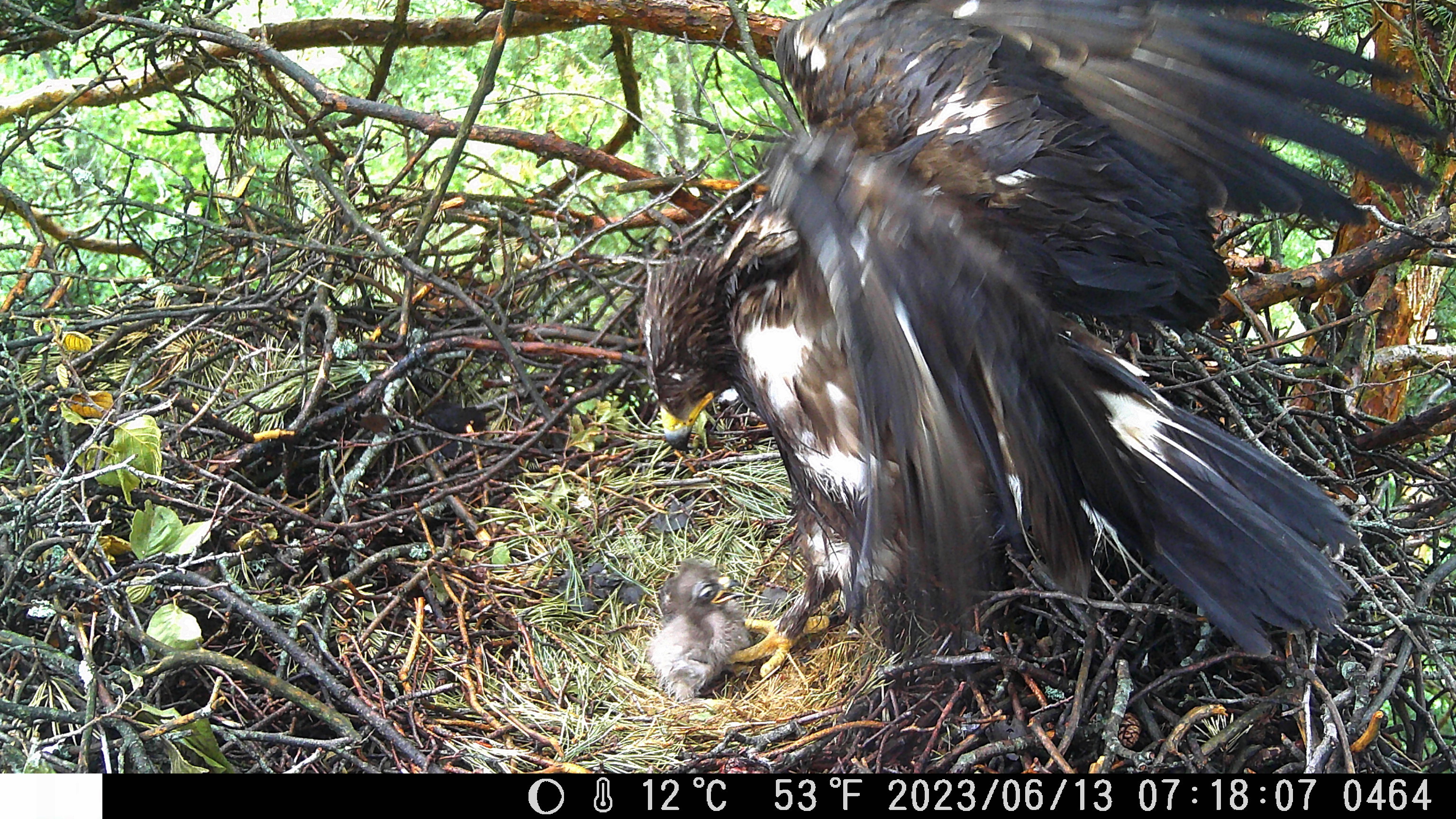 Пара 3. Успішність і продуктивність гніздування 50%. Така сама історія, як і з попередньою парою – друге пташеня загинуло. Пара мала 2 гнізда на одному лісовому острові (відстань між ними 300 м), одне використовувалось самцем лише на початку весни, після цього практично не відвідувалось. Ця пара відома з 2012 року і вона гібридна (самець малого підорлика х самка великого). У 2023 році самець змінив самку на іншу – це ми встановили за металевим кільцем, яка також була помічена у білорусі кільцем серії ВА (номер до кінця не зчитаний). Друге пташеня успішно покинуло гніздо та відвідувало його до середини вересня.