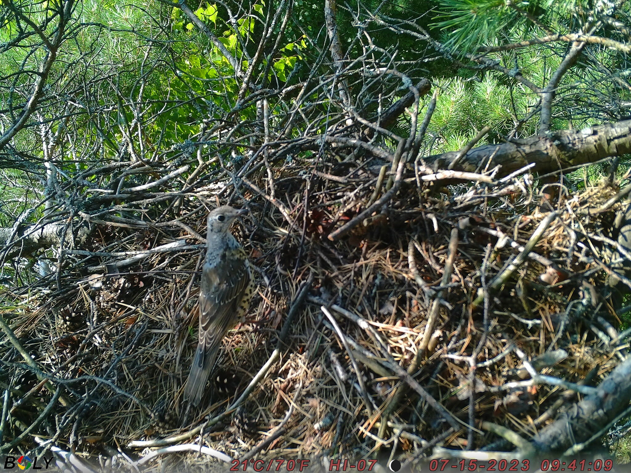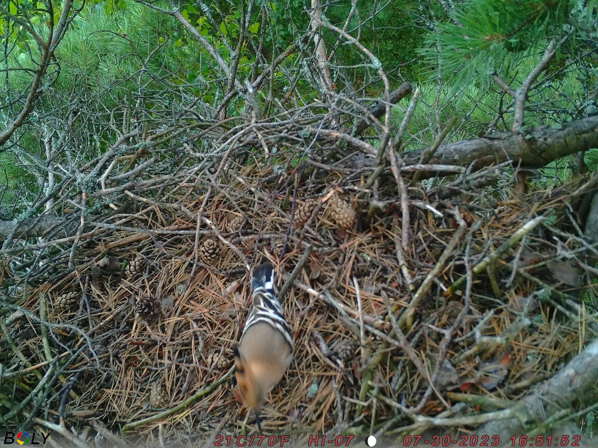 Гніздо змієїда розташоване у відносно молодому сосновому лісі з вкрапленням берези. Протягом наших моніторингових досліджень ліс зазнав пожежі, а гніздування змієїда у 2020 році було невдалим. Отримані дані від фотопасток включають періоди з 13 березня по 19 червня 2021 року та з 04 квітня по 05 листопада 2023 року. Слід зазначати, що у 2021 і 2023 роках змієїди у даному гнізді не гніздились. За цей час було відмічено 146 випадків відвідування гнізда 15 видами. Частіше за все гніздо відвідував дятел звичайний (Dendrocopos major) (52 спостереження). Синиця велика (Parus major), сойка (Garrulus glandarius) та синиця чорна (Periparus ater) були помічені на гнізді 17, 16 та 14 разів відповідно. 15 випадків фіксації канюка звичайного (Buteo buteo) свідчить про зацікавленість птаха гніздом і, як показали спостереження наступного року, ця зацікавленість завершилася його гніздуванням у ньому у 2024 році. Також гніздо відвідували горихвістка звичайна (Phoenicurus phoenicurus) і синиця чубата (Lophophanes cristatus) – по 6 разів, зяблик (Fringilla coelebs) та дрізд-омелюх (Turdus viscivorus) – по 5 разів. Змієїд потрапив до об’єктиву фотокамери лише чотири рази, двічі залітав дрізд чорний (Turdus merula) і лише по одному разу були відмічені припутень (Columba palumbus), одуд (Upupa epops), а також вивірка (Sciurus vulgaris) та куниця лісова (Martes martes). Слід зазначити, що типовими мешканцями даного типу лісу є різні види синиць, дрізд-омелюх, зяблик та сойка. Як буде показано далі, куниця лісова відвідує всі гнізда, на яких ми мали можливість встановлювати камери.
