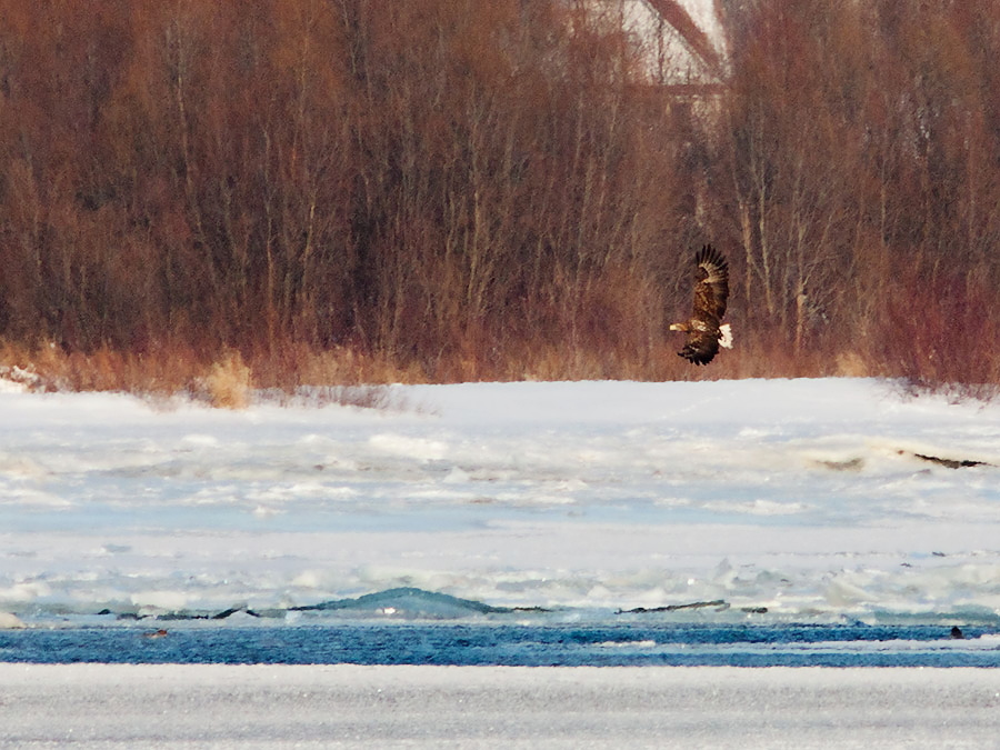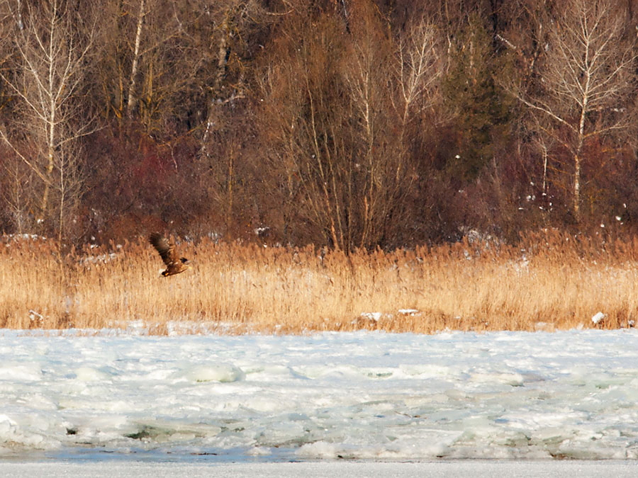 На Дніпрі в районі Канівської ГЕС кількість орланів протягом зими була не дуже значною. Чисельність їх не досягала рівня попередніх років, коли на зимівлі реєструвалося до 29 (28.01.2012 р.) (Грищенко, Яблоновская-Грищенко, 2012) і 31 (14.01.2013 р.) (Грищенко и др., 2013; Гаврилюк та ін., 2014) особин. Переважно це були молоді птахи. Протягом зими 2013/2014 рр. кількість орланів не перевищувала 20 птахів. 28.12 було обліковано 14 особин (4 ad, 10 imm), 24.01.2014 р. – 20 (7 ad, 13 imm). Під час сильного похолодання у кінці січня – на початку лютого орланів біля Канева трималося не більше десятка: 30.01 – 5 (1 ad, 4 imm), 3.02 – 9 (4 ad, 5 imm), 5.02 – 10 (2 ad, 8 imm). Лише з настанням потепління чисельність їх знову почала зростати: 16.02 обліковано 14 птахів (4 ad, 10 imm).