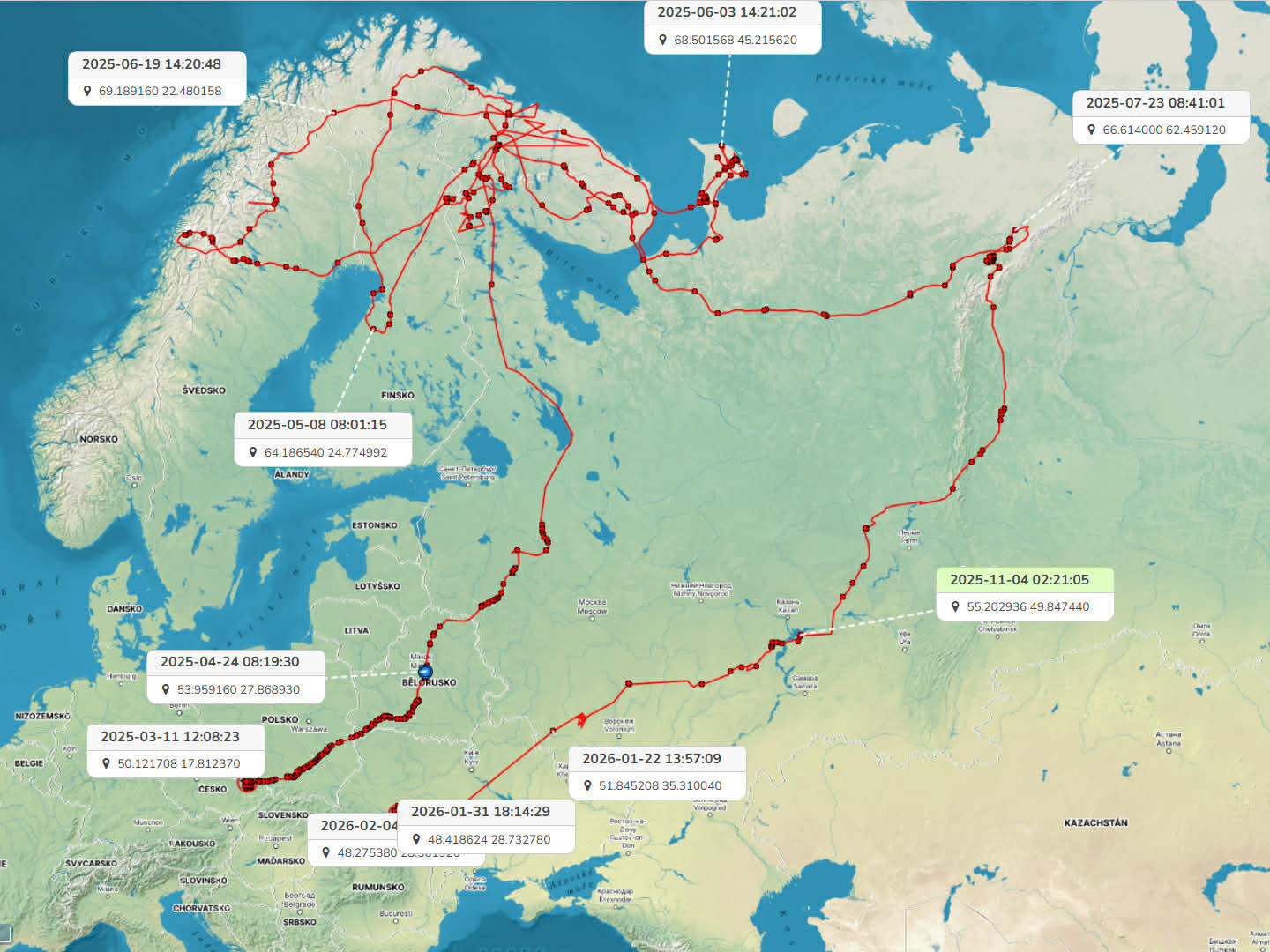 8 березня 2025 року на території Чеської Республіки біля селища Břidličná в Моравському краї Ondřej Boháč відловив зимняка. Було визначено, що це самець 3-го календарного року життя (3cy). На якого було надіто GPS-GSM передавач фірми «Anitra».