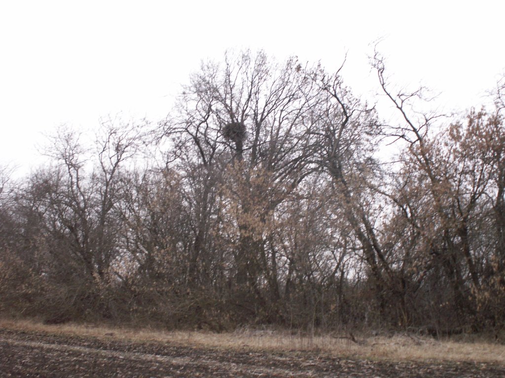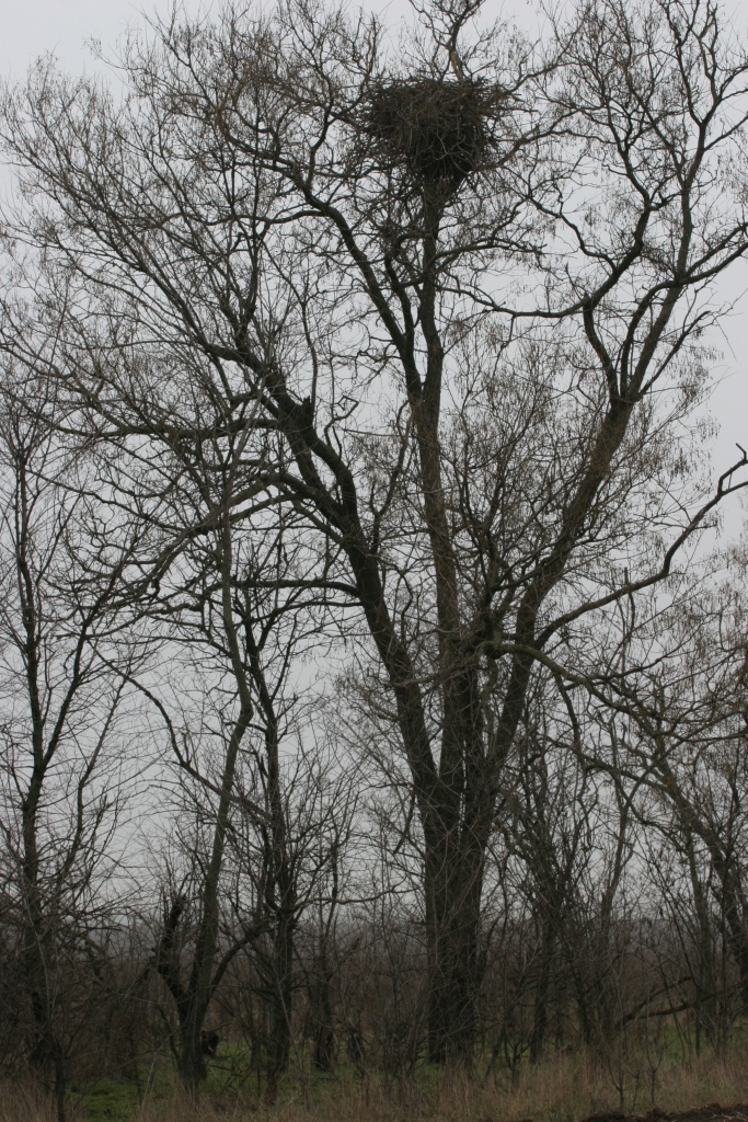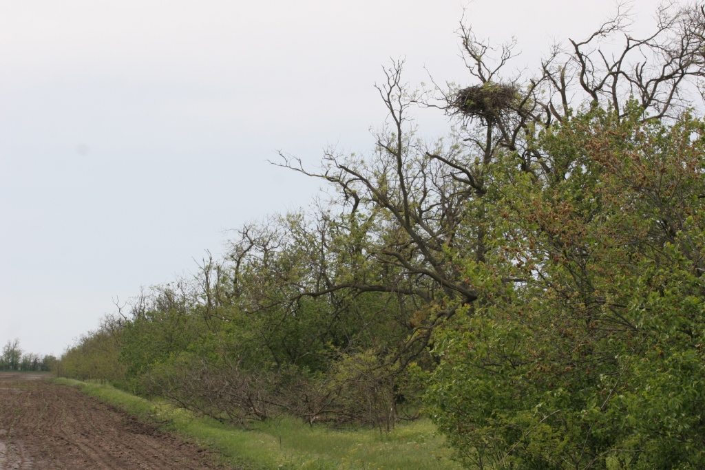 Еще один случай гнездования орлана-белохвоста в лесополосе между полями отмечен нами в Березанском районе возле с. Калабатино, на удалении около 4,5 км от Березанского лимана. Вдоль этой лесополосы также нет полевой дороги. Взрослых птиц в гнездовой период отмечали в этом районе с 2010 г. Здесь 08.12.2013 г. обнаружено гнездо, возле которого сидел взрослый орлан. О многолетнем гнездовании орланов в этой лесополосе свидетельствует находка спиленного, вероятно весной 2013 г., дерева с массивным гнездом орлана (высотой до 1 м). Оба гнезда орланов были построены на софорах, на высоте около 8 м. Расстояние между деревьями с гнездами – 300 м. 22.03 и 12.04.2014 г. мы наблюдали на гнезде насиживающего орлана. 22.03.2014 г. к гнезду подлетел ворон, орлан приподнялся с кладки и отогнал его. При осмотре гнезда 04.05.2014 г. оно оказалось брошенным. Гнездование орланов в 2014 г. оказалось неуспешным из-за фактора беспокойства. Поля с обеих сторон лесополосы осенью не были засеяны. Весеннее засевание подсолнечником двух больших полей с запада и востока от лесополосы заняло значительный промежуток времени и привело к спугиванию орланов с гнезда. Очевидно, вороны использовали фактор беспокойства и разорили кладку или выводок.