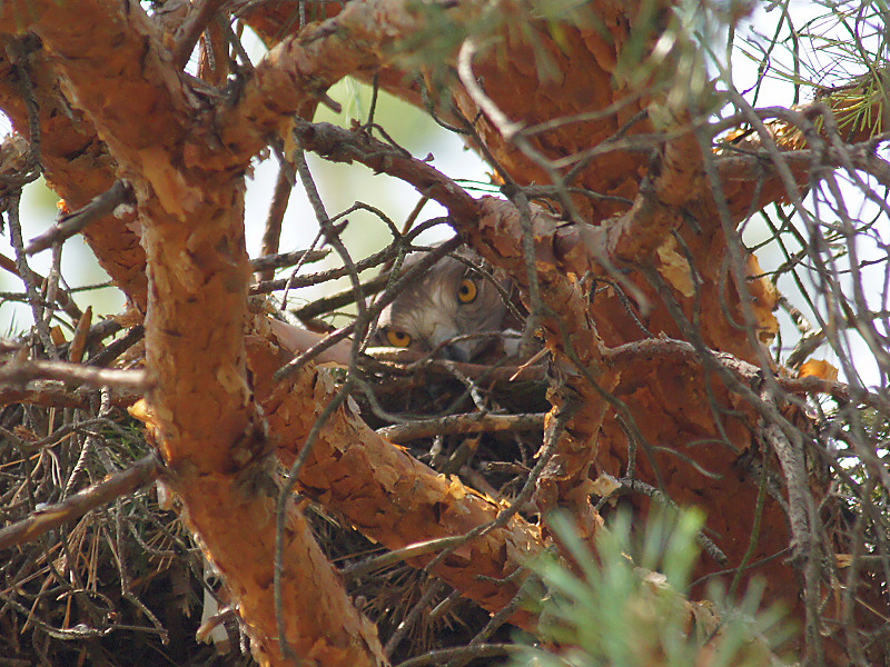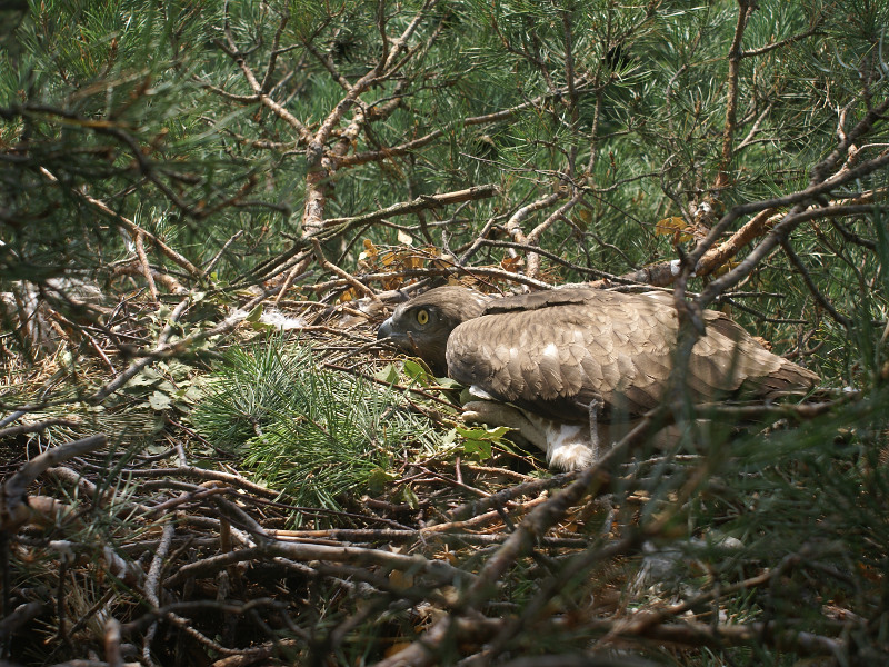 We have found a nest of the Lesser Spotted Eagle situated on a pine-tree. This kind of trees is rarely used by the species for breeding in the investigated area. In the nest there was a quite large chick. In an old nest of the Hooded Crow, located on the power line pylon, we discovered chicks of the Hobby Falcon, looking curiously out of the nest.