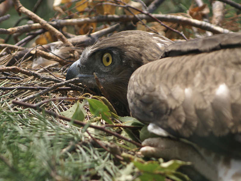 To investigate nests and observe the Short-toed Eagles we decided to visit Kyiv, Zhytomyr and Chernihiv Regions as this raptor is rather regular there. Thanking to Konstantin Pismennyi, our expert on the Short-toed Eagle, for six years involved in monitoring of these birds in Polissia, in one day we managed to visit 3 nests of this raptor, hidden and careful on its breeding sites. Unfortunately the first nest was empty. Reasons of the chick’s death remained unknown. The second nest, located at the side branch of a high pine-tree, contained rather a large chick. Miroslav Dravecky made a climbing on this rather difficult tree and took photos of the chick. The third nest (placed in the territory of the Regional Landscape Park “Mezhrechensky”) has been under our observation already for a long time; in winter we installed anti-marten protection at the trunk of the nest pine-tree. This nest also contained a large chick. The hidden juvenile was seen through optics. Not to disturb the pair we were satisfied with observations from ground. To observe hunting Short-toed Eagles we have done prolonged stops in the river valleys of the Zdvyzh, Teteriv, Irsha and Desna. Our guests were astonished with regularity of meetings with these birds in hunting habitats.