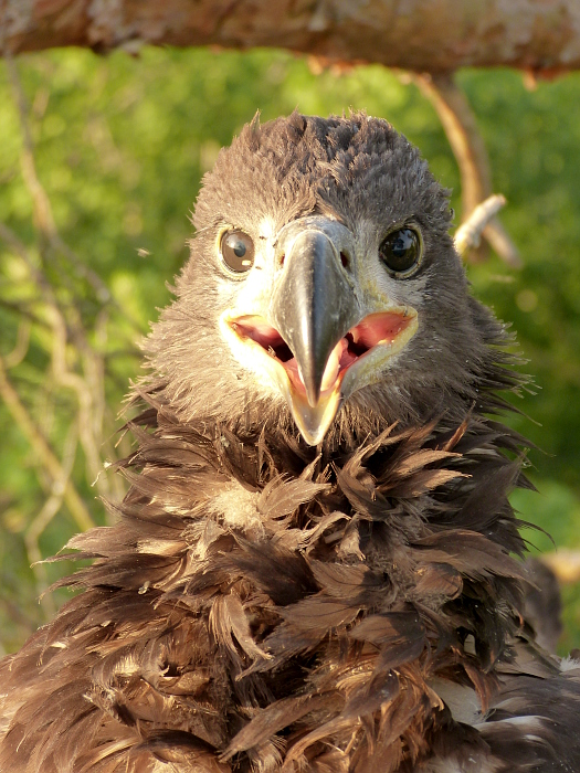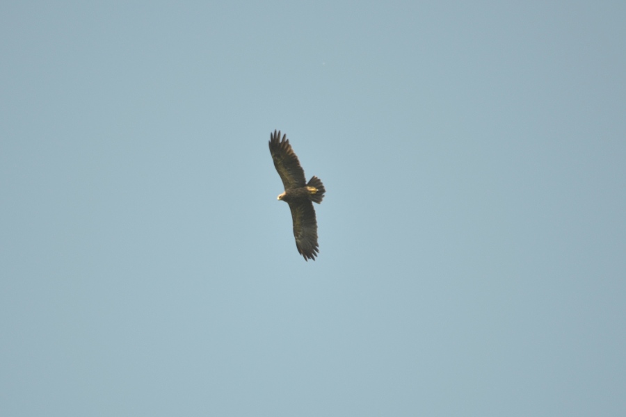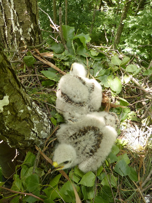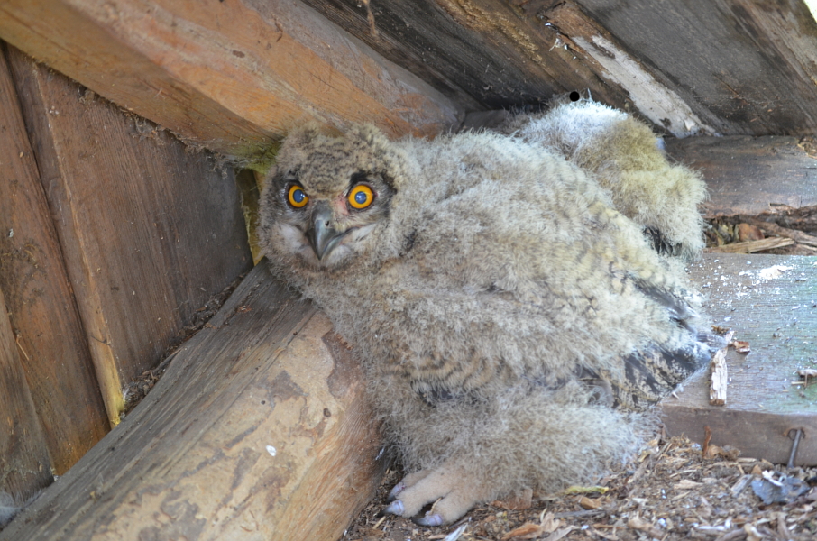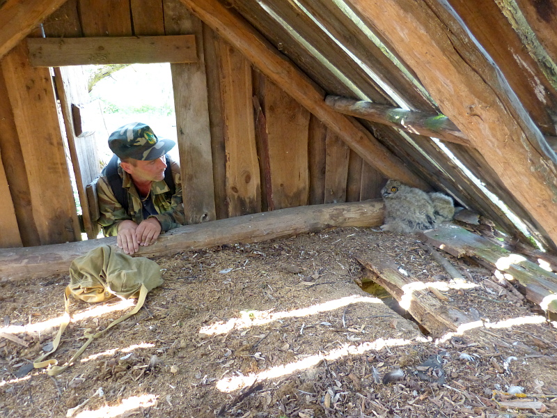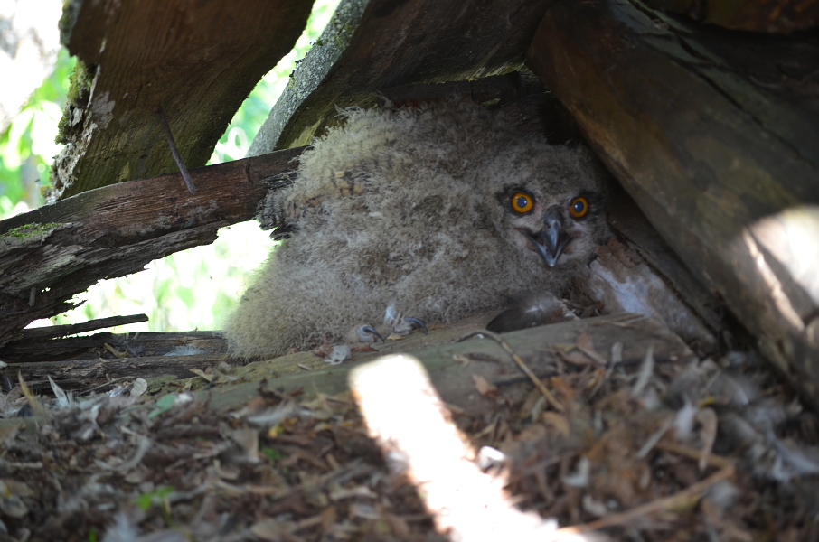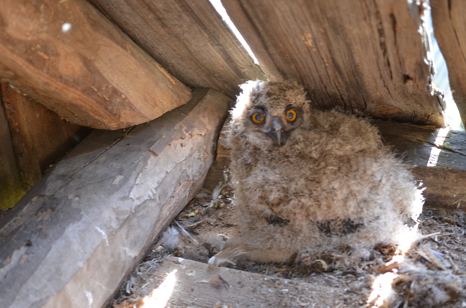 First sites of forests and meadows we investigated in Tolstolesivske Forestry. There were surveyed 9 nests of feathery raptors, of them only 2 were occupied by birds. One nest belonged to the Buzzard, four chicks there; the eldest is about 2 weeks. One of the most impressing finds was an occupied nest of the Spotted Eagle. Obviously, this is a single known case of breeding this species in Kyiv Region for over last 30-40 years. However, this pair of birds were hybrids: female of the Spotted and the male of the Lesser Spotted Eagle. Another luck was discovery of an Eagle Owl’s nest in the place where we had observed an adult bird from a breeding pair on 7 April in the village of Bovishshe. The birds reared chicks in an attic of the small bathhouse which still stand half-flooded by waters of a small rivulet. The brood included 3 chicks (2 females and a male, which was the youngest). The eldest owlet was about 1 month age. The attic roof composed of planks, slits between them about 5 cm wide. The floor was covered with feathers and pieces of bones belonged to the Eagle Owl’s prey. Judging by the state of some feathers and bones, the Eagle Owls nested in the place for at least the second year.