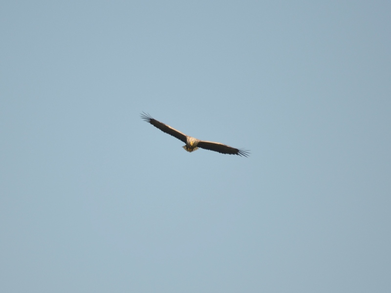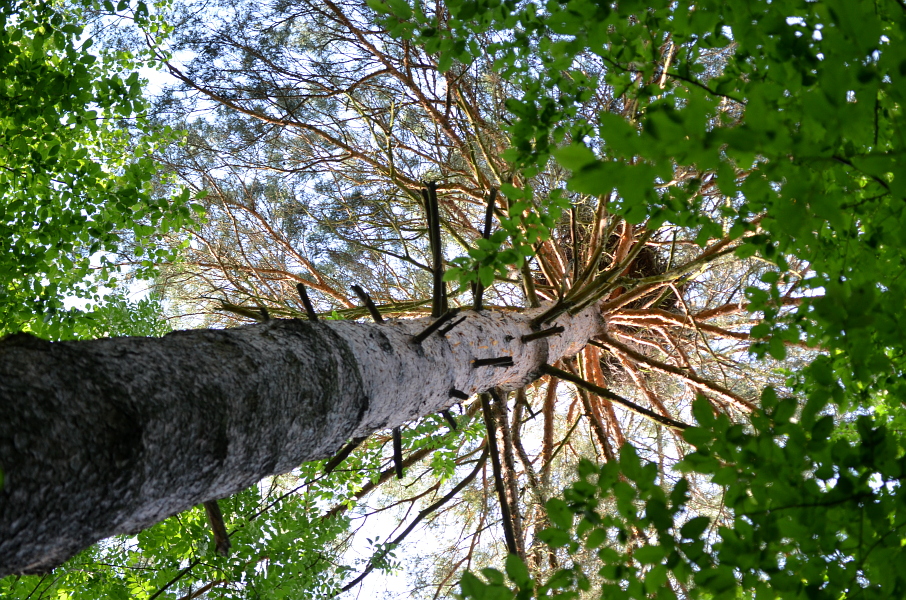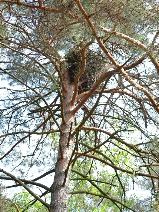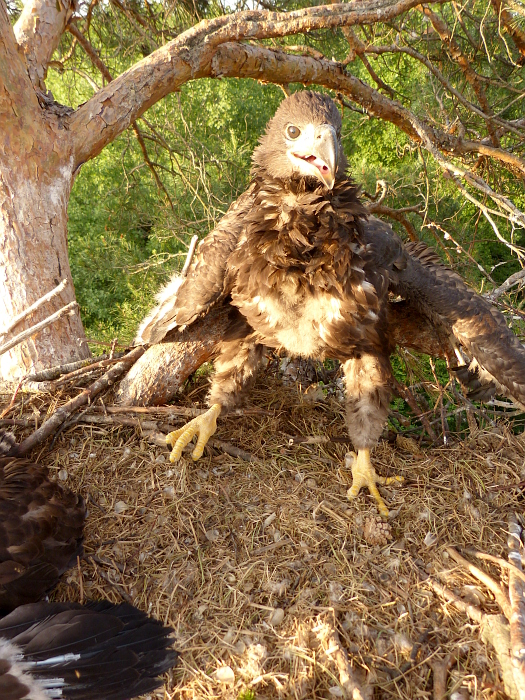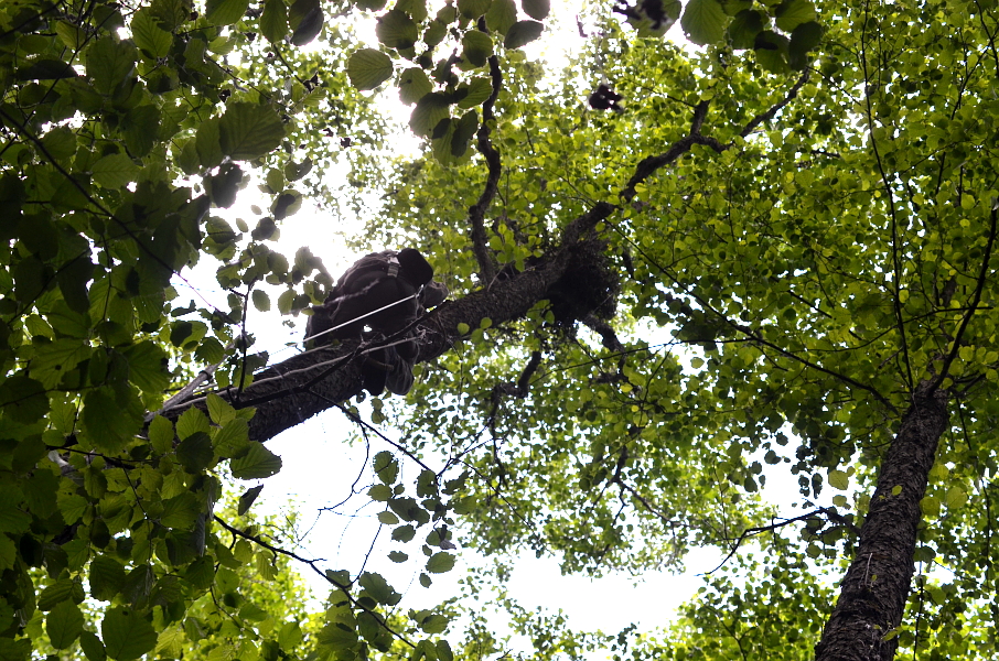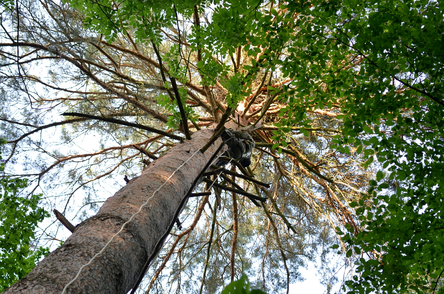The second part of surveyed forest and meadow areas was located in the Uzh River valley between the villages of Novoselki and Glynka. Following the same scheme we checked 5 raptor’s nests, of them only 4 were used (3 nests of the Buzzard and 1 of the White-tailed Eagle). We checked a hard-to-get old nest of the White-tailed Eagle located on the pine at the height of 25 m. Ascending to the nest, surveying it (taking photos and ringing of chicks), and then descending took 1 hour 55 min. The nest had 2 chicks of about 5 weeks age. In the diet we noticed remains of fish and Black Stork. Close to the CAPS we also inspected a nest of another pair of these eagles but unfortunately their breeding was not successful. In the tray we found a half of the egg with an undeveloped chick.